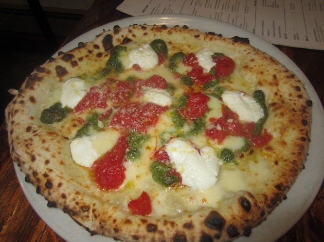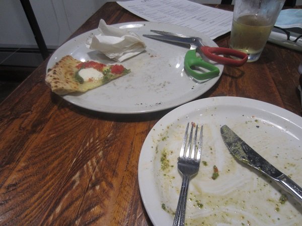 Just returned home, after another great Wednesday Pizza! This was the TriColore one, with plenty of tomato and pesto on it. It's the colours of Italy's flag! How can I resist this pizza? Walnut pesto? Never noticed that. Pesto is just 'pesto' to me. Supposed to be raining all day, but for one reason or another, it wasn't raining now. Just beautiful! This with Chile Oil on it is very tasty. Finished, with that slice for David. Good pizza I'd like to repeat again.