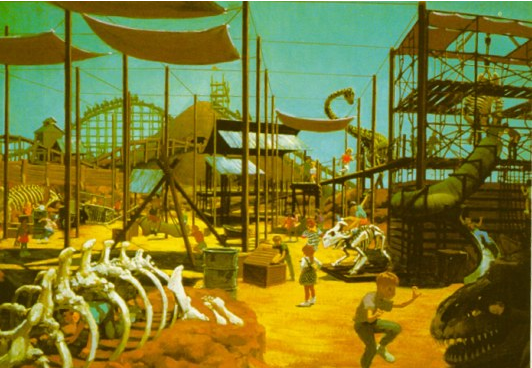 I actually think it was brilliant of Disney to take the same ride system AND 'track route' and overlay it with an entirely different story, theme, etc. etc. They did it with Tower of Terror in DCA. They're doing it with Rock'n'Roller Coaster in Disney Paris' Walt Disney Studios. Now whether the ch-ch-change is good. I'll have to eventually ride Dinosaur myself, as I haven't had the epic opportunity ....yet. But I have ridden the Tokyo DisneySea version a number of times. The entry queue is changed. There are no (Um... Spoiler Alert?) three doors to "choose one" and ride through, etc. And they put in a Smoke Ring effect, I'll just mention here. And the exit is pretty quick, too. And by the way... isn't there a thread somewhere in here, for Animal Kingdom, etc? Just asking. EDIT: Found it, and BUMPed it. And Bert? ^^ I have Blue Sky hopes & dreams, for that actual wooden coaster (called "The Excavator," I remember?) they originally planned for that "Land." To take the place(s) of Primeval Whirl(s). Here's the artwork I remember seeing - Boneyard w/"The Excavator" coaster in the back.