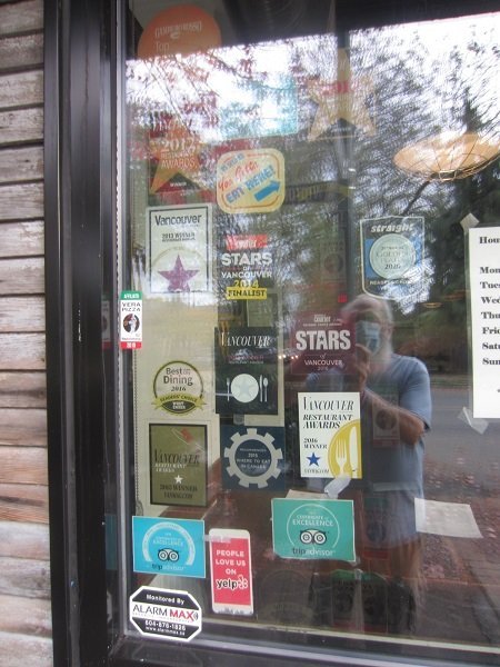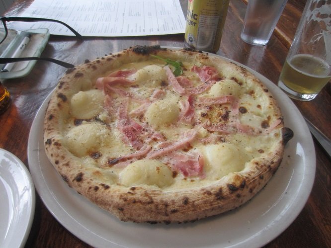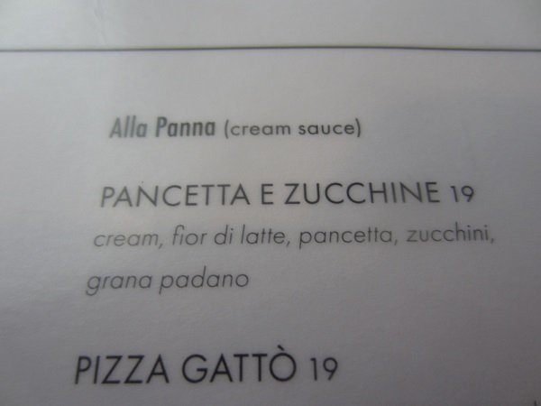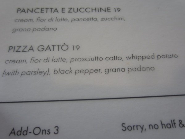 "End of The (Cream) List...." There were only two "cream based" pizzas to try - and this second one really caught my taste buds into something new .... whipped potatoes on a pizza! I saw it before, in the menu, but I really had no idea how delish it would be, with this particular "topping". This became my go-to cream pizza for the win! This place has won several awards and food mentions over the years. Here we go. Last one on all three lists. But ..... whipped potato on it ....? And ... I was not alone as I usually am on this weekday. Two tables behind me! People are catching on to the new opening time. Darnit. More suds than beer! I let it sit awhile. A gloomy kind of day, it was. Back view of all those decals. (o; What's this? What's this? I thought it said "cappicolo" not "prosciutto"....! Must have, next week. <drool> Beautiful. And it was done. And the partner "got that slice".