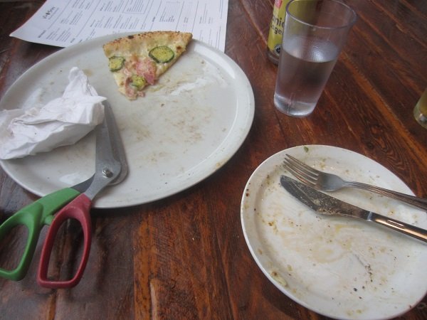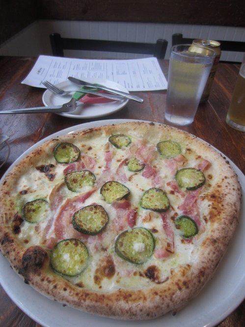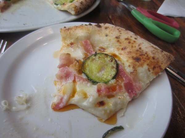 Last Wednesday, I had one of the two "Cream Sauce" pizzas available. I'm not too sure what the Italian translation of this is, but I must say, it was really good, with an entire (what I tasted) melted mozzarella base on it. Definitely tasty, and worth getting again. "cream sauce." I should ask what this 'cream' actually is, on a future visit. Our apartment neighbours' roof is finished! Looks lovely. Loved the pancetta and zucchini on this pizza. All done, with a little slice left for David.