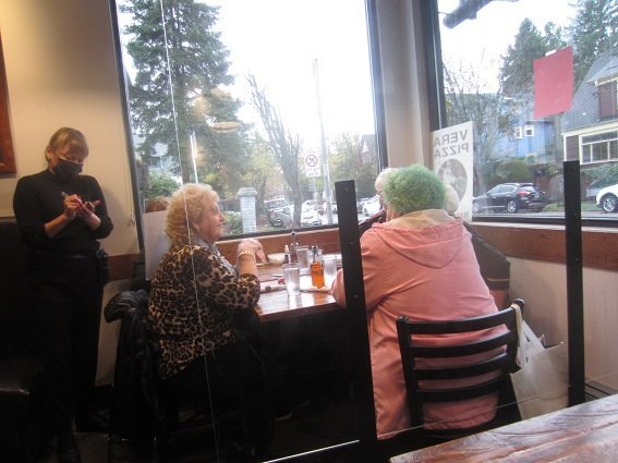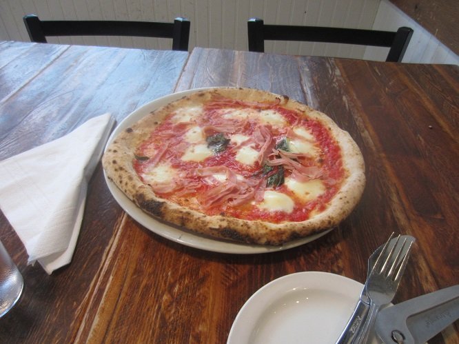 The last pizza to try, brought me back to the top of the menu list. The red list, with my getting the Margherita pizza w/Prociutto on it. And it was as good, as I remember the same pizza with salami on it, when I started this 'thing.' https://viateverepizzeria.com/ It was a wet afternoon, last Wednesday. A reminder of what I was having - with everything spelt the correct way too, lol. Nice that a group of friends get together, for pizza and chat. \ Ready for it. Lookin' good there! And .... it was good! And I think I enjoyed it more, than with salami on this pizza! All done. And I "nearly" finished it all off, w/o taking any back to the partner. But I guilted myself out.