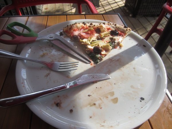 Yesterday, I had what is simply the most expensive pizza on the menu .... $22 Cdn. Which is what? Twelve bucks in U.S. money? But it had artichokes, black olives, salami, mushrooms and a couple of other things to make it a really loaded pizza, lol! And I enjoyed it so much, I decided to finally save a piece for David, since he kept bugging me to do so. Been over a year since I cut the middle out of the rhododendrons, finally exposing our front porch. What they wrap the utensils and napkin in. The Capricciosa. And "fior di latte" is Italian for "milky fresh mozzarella." And ecco qui! So beautiful, I hate to cut it up. But this is what $22 Cdn. gets you. Down to the last slice.... Which is saved for David. And he loved it, of course. Next visit: An olive oil-based pizza!