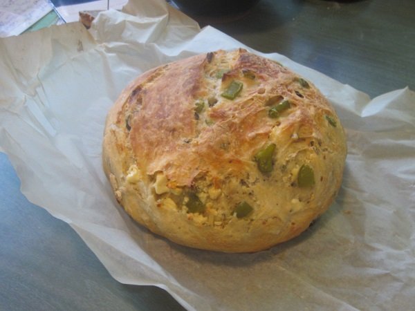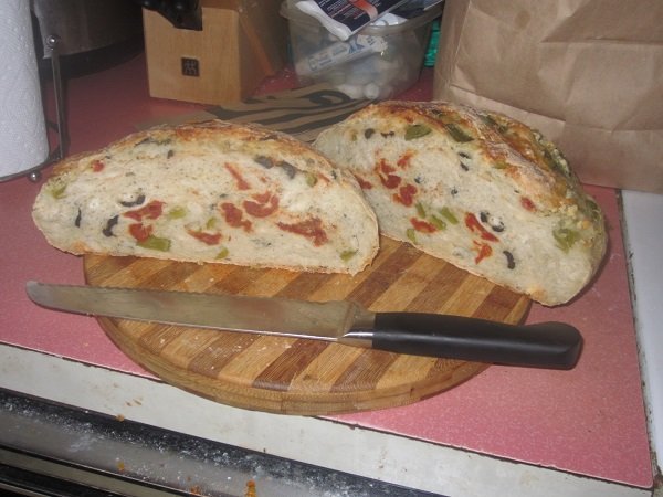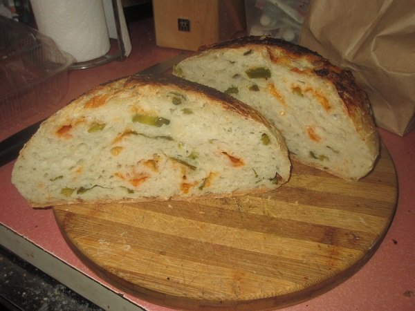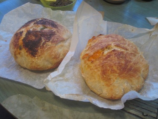 I made two more loaves of Jalapeno-Cheese Bread yesterday. One loaf for us, and the other for our great neighbours next door, Liz and Terry. They loved it more than the 5 Seeds loaf I gave them before! And ours turned out great, too. Except I forgot to add the grated parmesan into it. So I decided to try something out, and sprinkled the cheese on top of the loaf, before baking it. Turns out, parmesan cheese BURNS. Period. Thankfully, the stuff didn't burst into flames and cause a kitchen fire, lol. The first loaf with burned parmesan on top. The second loaf is behind, going through it's first rise. Second loaf. Much better with the parmesan inside the bread. Side by side. Now which loaf would you pick to have? Our loaf, cut to show the cheese and pieces of jalapeno in there. Great bread, even with burned parmesan on top.