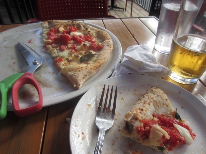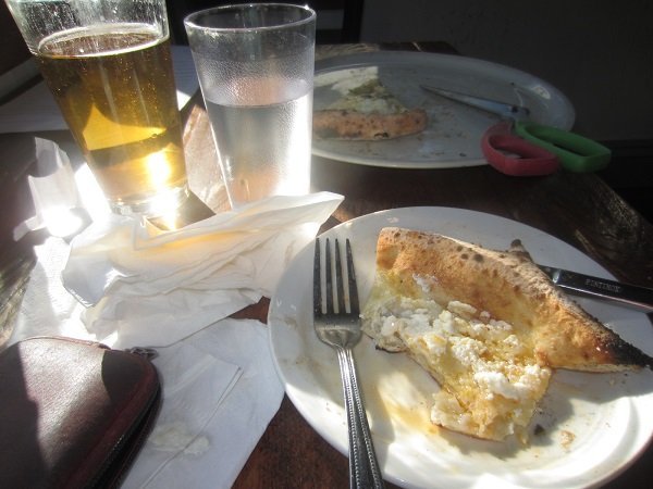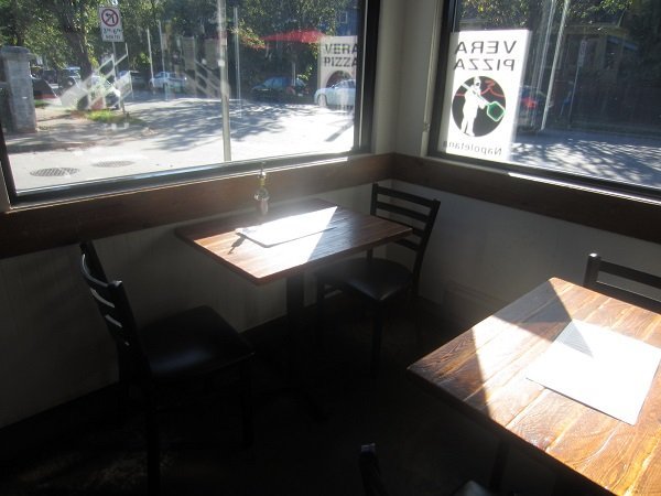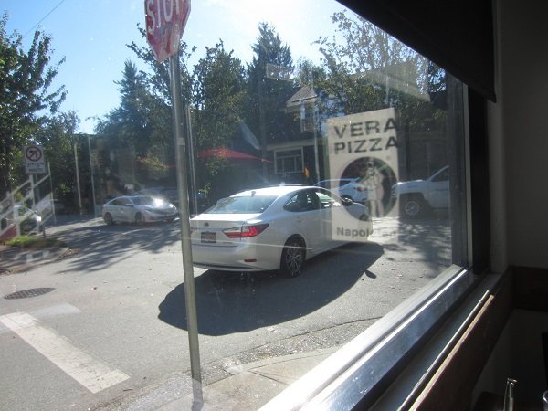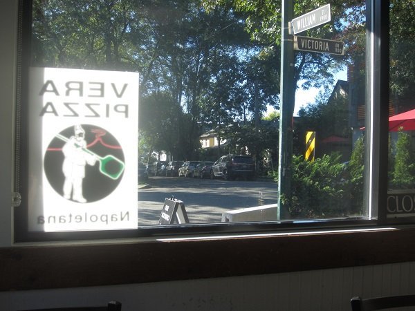 Hmmm. "And then there was the last pizza I had....." This one had four cheeses, and I paid extra for adding leaves of Basil . Well, to be honest, I wasn't taken with this one. The fact that it was basically the flatest pizza I had seen from this pizza place... I think I am still missing tomatoes on any part of a pizza, be it the base, or as a topping. But I am still going to continue weekly with a few more olive-based pizzas to go. I want to try all they have in this place. And compare what I've had, etc. http://viateverepizzeria.com/ And it was a touch windy and cool outside, so I sat inside for the first time, in a long while. They put me in the corner of the place. To my left, part of the Victoria-William St. 'intersection'. Looking out in front of me. Not much to be able to see, compared to being outside. The Four Cheese pizza. With Basil added, a$ extra. I could count the basil leaves on this. I just thought there'd be more of them. The white blobs were the Riicotta. It tasted alright. Nearly finished, with a last slice to take to David. Total with tip = $33.53 Cdn.