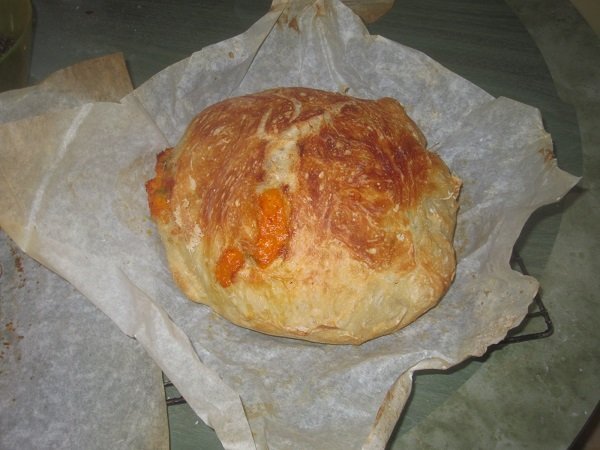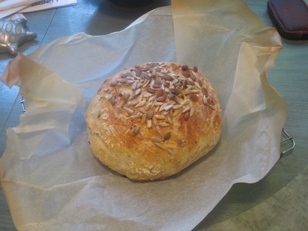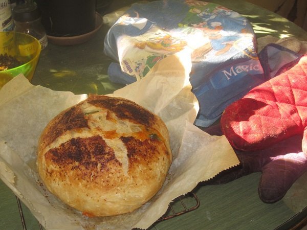 I made a couple more loaves these past few weeks. I repeated a "5 Seeds" Bread, but upped the amount (1tablespoon vs. 1 teaspoon) of the three smaller seeds (flax, sesame, chia) in it. Made it for our nice neighbour next door, who's always giving us BBQ meats and such. The first loaf shown here, was what I called my "Greek Loaf." It had green and red peppers in it, a "Greek Seasoning" shake or three, and small cubes of feta cheese. The feta did not work out that well, with the bread. The cubes stayed as they were and actually became chewy in the bread. Didn't like that, so in the future, I will try to figure out a better cheese to use .... but still keeping it "Greek" of course. My Greek Bread, fresh out of the dutch oven. Looked great, but the feta didn't work out, taste wise. Will try a similar cheese, next time I make this. The "5 Seeds Loaf" with lots more seeds inside. For Liz and Terry, next door.