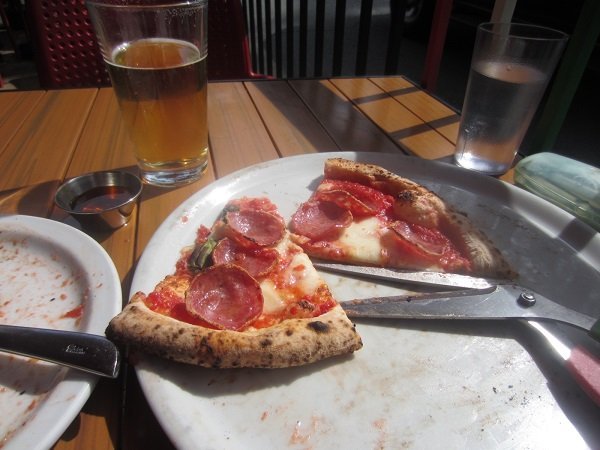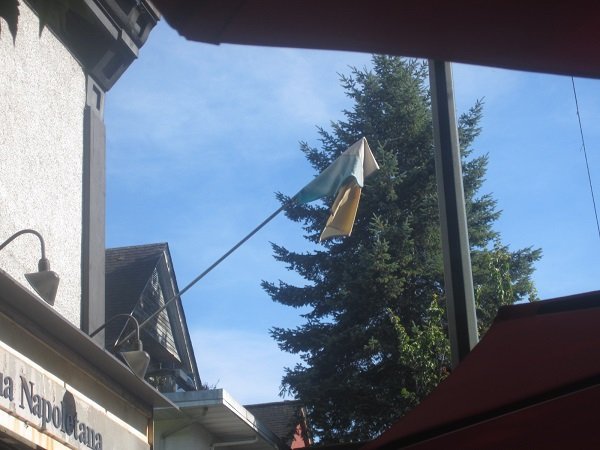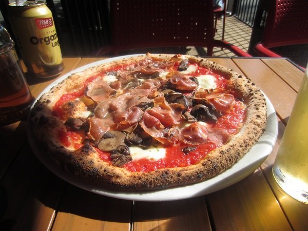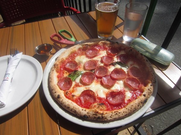 ^ Yeah well, you have to remember when he posted this all, right yes? No? Eh.... Shakey's Pizza in Bellingham, WA Forever! So, it's been several weeks since "My Very First" visit to https://viateverepizzeria.com back in May. Since then, I've been back to the place five times! Each visit a different pizza. I did skip one, but will explain that later. This was again the Margharita pizza, but with salami added. This was also my first introduction to "the chile oil" on the table. Great pizza! I am definitely a meat eating kind of guy, lol. The next visit (usually on the Wednesday, when they open at 4pm) I went with the Marinara, which is a pretty basic kind of pizza. But instead of a tomato 'sauce' they used crushed tomatoes on this one. I felt that made all the difference. They also threw in some garlic cloves and oregano, which was a nice touch. And I still got a kick out of getting slices with the pair of scissors! I still used a knife and fork to enjoy each slice. No "rolling" at this point for me, heh. And they switched it up, from a little one server metallic cup, to a good sized bottle of Chile Oil! Good choice. Sat looking the other way up Victoria Dr. Three things, the crust .... and that's it for a Marinara! Noted. I did enjoy the crushed tomatoes part of it. Now I can slather on as much chile oil as I want to, bwa - ha - ha! The following Wednesday, it was this pizza totally blanketed in Arugula! The prosciutto was nice, cooked in the pizza. I enjoyed having just more than a couple of 'things' on my pizza. The bottle of chile oil awaits, too. So the rest of it must be ...under the arugula? It was good. I would order this one again. Hmmm. I really think their Flag of Italy could use a replacement flag? After this one, there was "the one with anchovies in it." I am only a fan of these fishies if they are (usually) in a paste, and used for creating one of those Caesar Salads, hmm yes? Whatever the case, I did enjoy it, but the anchovies here and there made for a jarring, very salty, taste in my mouth. I would not order this one again. But I liked the taste novelty of it all. Looking out front, from our porch. Great sunny day, it was. The view of Victoria Dr. from this chair. Fuzzy, but readable. Note: anchovies. And basil. Utensils of choice. Looks beautiful, even with the anchovies in there. And lastly, just eaten this past Wednesday, was a real fave of mine, now. With funghi, too! Note that I skipped the VESUVIO pizza. Too much spicy meats for myself. Piccante = HOT! So I skipped it. Yum right?!! Again all the meat cooked in the pizza. As well ....Chile Oil! A no-brainer to eat it all up, hmm? And....there it is. Five more visits to our local pizzeria, Neopolitan style.