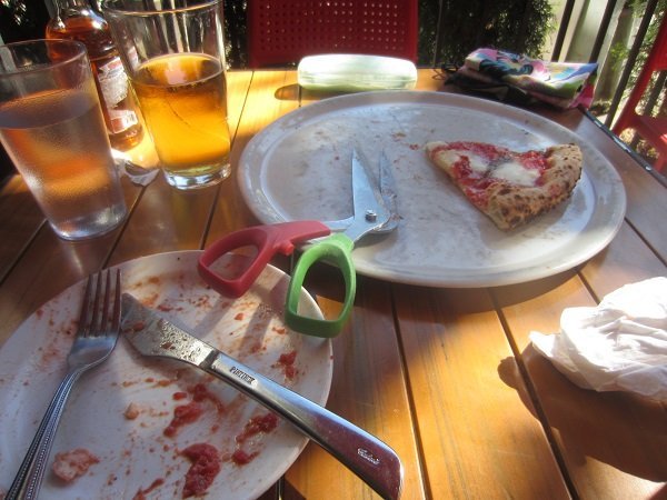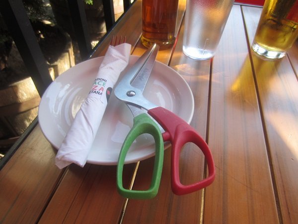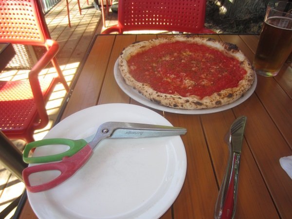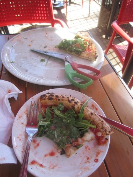 What I enjoyed about the scissors, is that I could cut these enormous slices... or just an itty bitty one, to test the chile oil on. I suspect that the take out pizza orders and delivery ones are sliced, unless asked not to, otherwise. P.S. They do ask you at the table if you'd want it sliced, or "do it yourself" etc? But for myself, I have now been there so often, they just bring the scissors over, along with the small plate and utensils. Which I appreciate them remembering.