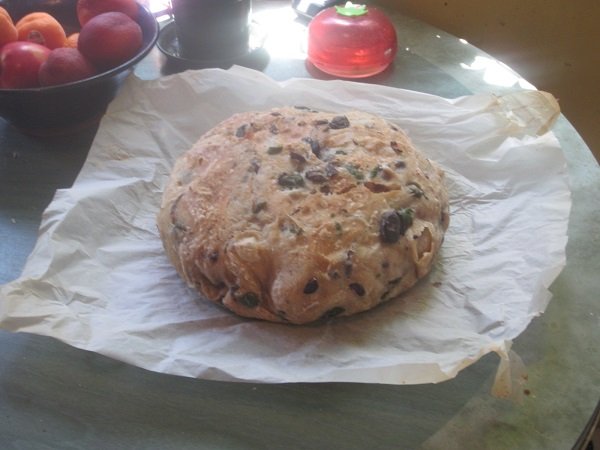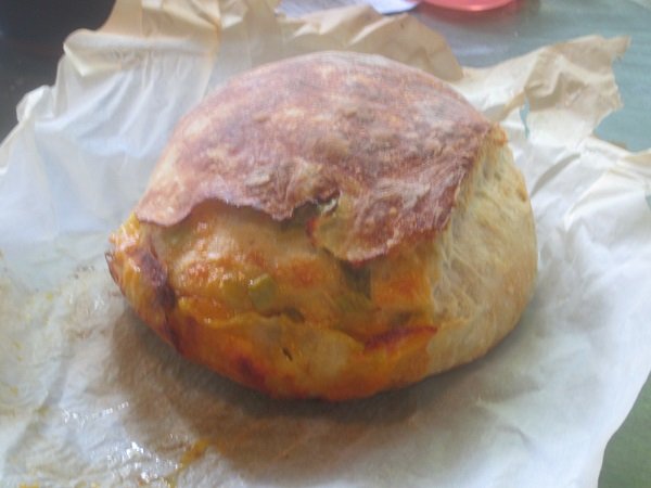 In the last two days, I made two loaves to take to a picnic, a friend had organized down in Stanley Park. Both turned out good, although I think I need to consider putting a 'slash' in the top of the cheese loaf before it goes into the oven. The cheese-jalapeno loaf seems to 'bleed cheese' again. No big deal. I gave it to our host for the picnic, so I hope they enjoy it. The Olive Rosemary loaf . I named it 'O'mmmmm. The cheese jalapeno loaf. Ooozing cheddar cheese, but what the heck, eh? Haven't 'named it', yet.