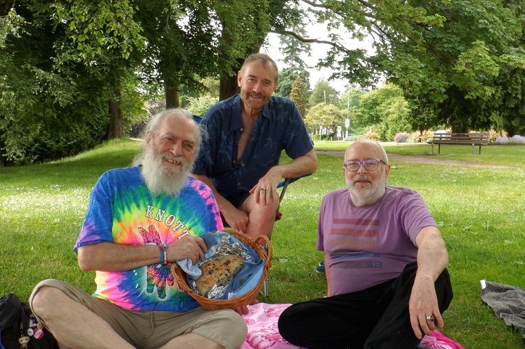 Here's a pic of myself, Trevor and David at a nice park-side picnic a friend organized. Clark also took the photos so ... thanks! June 19, 2021. Me holding my homemade/baked Olive-Rosemary loaf (which everybody loved!), Trevor behind us, and my David.