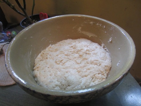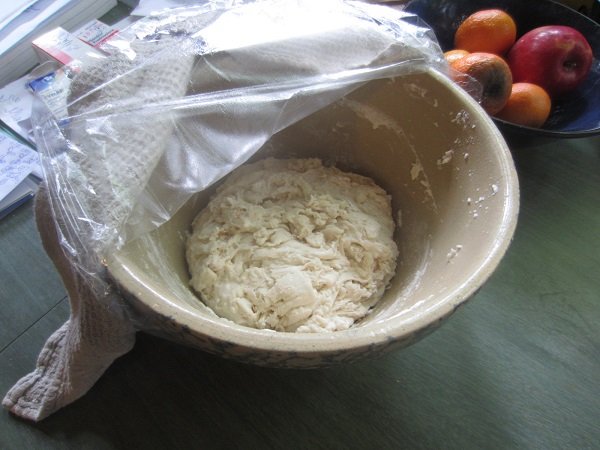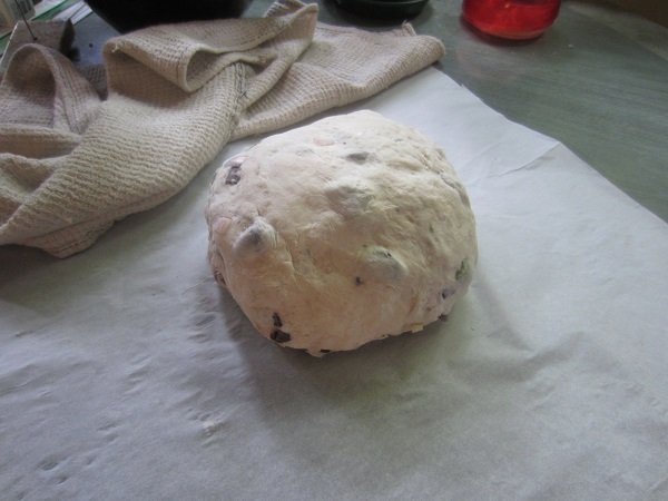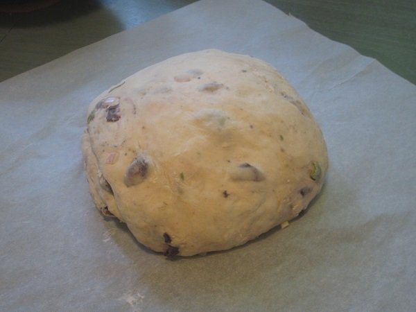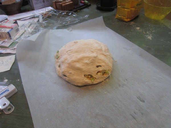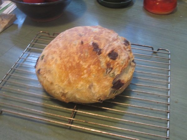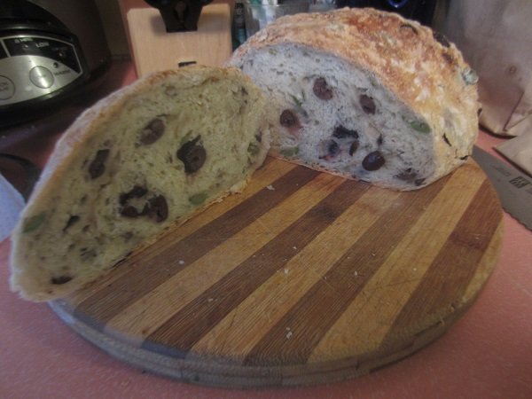 My fifth loaf turned out really good! The best of the five I've made and baked, so far. The add-ins were: 1 cup of Kalamata olives and 1/2 cup Calvestrano olives, both pitted and halved/chopped. They were folded into the dough before the first rise of 6-8 hours. Then, 1 large shallot, finely chopped, and 1 tablespoon of Rosemary leaves, also chopped up, were thrown in before the second rise, 1 - 1-1/2 hours. I am also finding out, that it's better to just flour the kitchen table and add stuff in, without doing it on parchment paper. Then I put it on the paper, for it's second rise. Baking in the dutch oven, in the oven, remains the same. The first rise. I actually let it go for the entire 8 hours. Shallots and Rosemary added in, and it's ready for it's second rising. After 1-1/2 hours ..... That looks about "double it's size" doesn't it? Into the pre-heated dutch oven it went. And forty five minutes later.... It's done! I decided to take a photo of the bottom of the loaf. Not bad. And it tasted wonderful! Definitely one I want to repeat in the future.