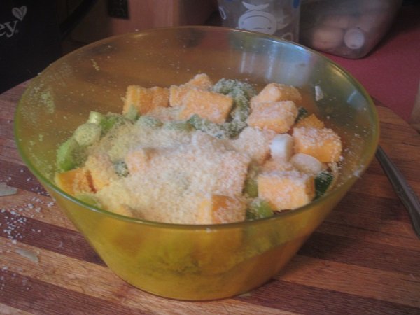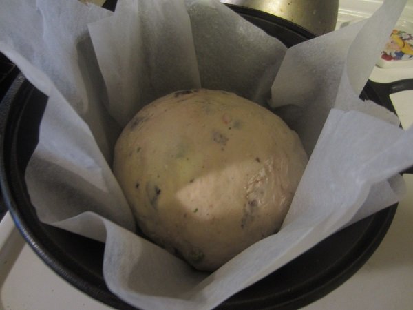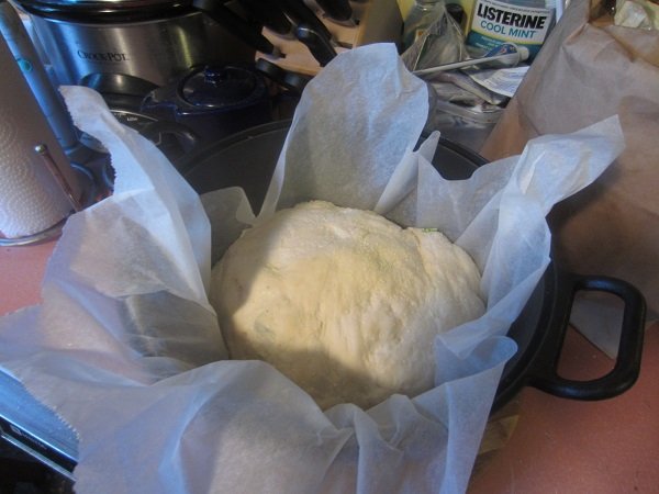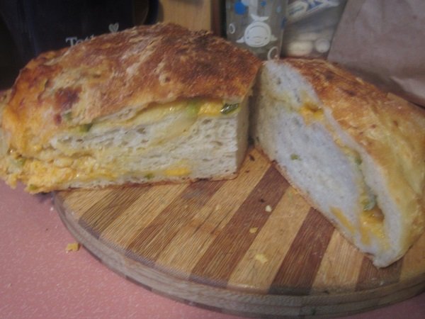 Made and baked the fourth loaf last weekend. I think I put A LOT more cheddar into it, than was listed in the recipe. No matter. The loaf came out pretty good, and we almost finished it by yesterday, lol! This coming weekend: it's a Rosemary and Olives loaf! Dough in the bowl for it's first rise, 6-8 hours. Green onions; ground parmesan; a jalapeno seeded and sliced thin; cheddar cheese, diced up. That did look like a lot of cheddar I diced up for this loaf. But I carried on... First rise nearly finished. I see some add-ins are trying to escape the dough, heh. Now it's a second rise for 1 to 1-1/2 hours. After the second rise, the whole thing, nestled in the parchment paper, in the dutch oven, already pre-heated. 45 minutes later .... Golden and cheesy, fresh out of the dutch oven. I think the cheese could have better distributed, but hey - I'll try to do better, next time I bake this one.