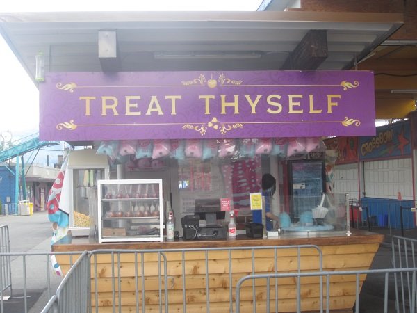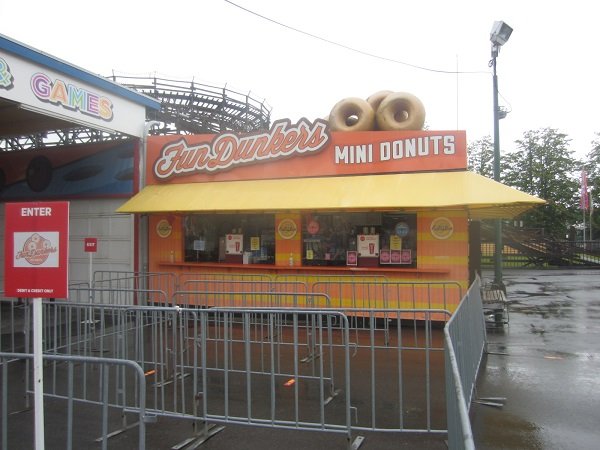 Here's the shots from Sunday. I think I spent less than an hour there. Totally overcast, with rain off and on. Noted. Wheeeeee! The overcast made it easy to see the lights on, on the various rides. Too close! I was here! Map is in front of where the "new coaster" is supposed to go. Eventually. I hope. Standing silent and lonely. Even the ghouls and ghosts moved out, for now. Okay. Time for some Mini Donuts! But only with maple glaze and sprinkles. Fine. 6 for $7. Just saw this at Customer Services, before I left. Very cool. -