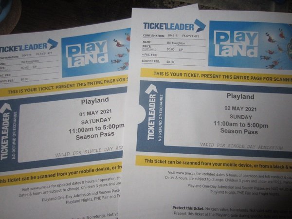 I FINALLY got my first two tickets to Playland(PNE), which opens the first weekend of May! I have to go thru TicketLeader for each and every single day admission to the park <sighs>, and have to use a Code they emailed me for future use .... but hey, I got not much else to do right now, and it is only open weekends in May. But, as a Season Pass Holder from last year, I essentially get all the visits I want to the park w/o having to pay a single nickle (we don't have pennies any more, lol) for the tickets. I hope. Otherwise, I just can't wait to even stroll thru the park, w/o having to ride anything!