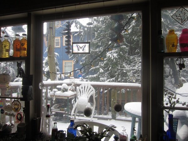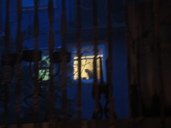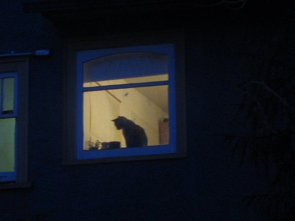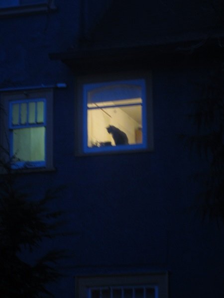 Took a few shots of a neighbour's cat, in the apartment bldg. behind us. These were taken at "twilight time," too. Which made the walls of the apt.building so 'Cobalt Blue' to see.