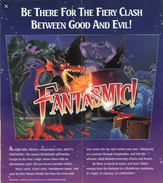 The one that really blew me away, way back when, was the early showing of Fantasmic! at Disneyland. We saw it in 1996 after it had been running for a few years. We didn't know what to expect of it (not much, if any, social media back then) and when the individual "Princess barges" floated by, I was tearing up. Truth! The cover of my souvenir booklet looked like this, when I bought it, in the (then) VILLAINS SHOP in FantasyLand. Wish I`d bought more stuff there, back then. -