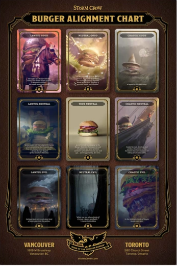 12. This is soooooo kewl! The Storm Crow Tavern here in Vancouver (and Toronto), is selling a "D&D Burger Alignment" Poster! I'll include the link to it here, so you can see "the cards" up close. But the write-up about it says.... https://shop.stormcrow.com/collections/frontpage/products/d-d-burger-alignment-11x17-art-poster Couldn't resist this, so I just bought one for myself. Ho ho ho! Below is the Dungeon Burger order sheet you'd use, with the 20-sided die. This form is a few years' old, so prices will have changed.