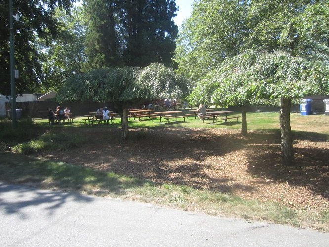 My visit yesterday to The Fair, was mainly to check out the gardens and Sanctuary that reside on the PNE site. AND to get myself some chicken from Henry's BBQ! Unfortunately, the chicken I got turned out to be somewhat dry, and not very juicy. No matter. The order of fries was f-ing HUGE! So much so, I had nothing to take the extra fries home with me. The container was too greasy, so sadly, I dumped about 1/3 that was left, into the compost bin. The first garden I visited was The MOMIJI Japanese Garden which was located beside the Garden Auditorium, where a (usual) themed display was installed. Past ones include, Game of Thrones; Hockey; The Beatles; Dungeons and Dragons, etc. But not since covid has there been anything there, except an ongoing circus school for young kids and teenagers. Which is great, all the same. Anyway, this garden has been around for several decades. Not very many stone lanterns and/or stone statues to be seen. But it's a quiet place, with running water into the small lake the garden surrounds. It's amazing how The Fair sounds fall away, when you're here or in the Sanctuary. The Italian Gardens, not so much. ^ The un-used Garden Auditorium looming over the Garden. Fun Trivia: This is where David and I attended Pink Floyd's "Dark Side of The Moon Tour". In the centre of the building , we all sat on the floor. And then I remember this lemon-scented smoke coming from the stage, and 'wafting' (wafting?) over everybody! It was trippy. What I remember..... Not exactly a Sacred Temple. But good enough, for sudden (and ongoing) rainfall. The Italian Gardens are more out in the open space of the fairgrounds. And a somewhat orderly presentation of walkways and fountains, etc. They also share space with two 'attractions' for the kids. One is the Discovery Farm, which was usually found in the Barns. The outdoor setting looks much nicer, to me. Also, a performance space called Toon City to entertain the young ones. The Discovery Farm looks great outdoors, and in this setting. The Toon City stage. Then it was time to get my BBQ chicken! This is what 1/4 BBQ Chicken, looked like. I bought fries as well. And a beer <g>. Too ~ many ~ fries! I couldn't eat them all. And as I said before, the chicken was more dry than juicy. (Flower)Pot-heads. After this, it was on to The Sanctuary. And instead of walking around the whole place, for $2 I took the PNE Express train to circle the green space. Which reminds me. This whole area used to be the row of three separate buildings, side by side, joined together by overhead walkways between buildings. Several decades later, all three buildings were removed, to create a massive green space on the fairgrounds, including a lake, and several spots to just chill out and enjoy the greenery. The train didn't get that close to the centre lake and other pathways. But it was a nice casual way to enjoy this as part of the PNE, with a lot of the noise from The Fair being muffled by all the trees, etc. We all agreed (on our train) that "This was the best ride at the PNE - and cheaper too!" The train. And look! It's a TRACKLESS ride! Got a pic of myself (finally) at The Fair, on The Train. The rest of our train load. The lake is there, once you look past all that greenery! Very woodsy here. Noted. A better look at the lake in The Sanctuary. On my way out of The Fair I saw this. Coming back tomorrow (Thursday) with David. -
