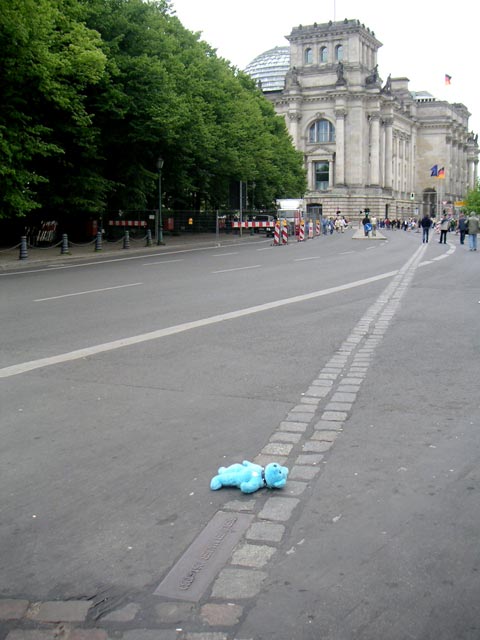 Well, I've looked and looked, and unless it's really DEEP in the threads there, I can't find one for this. So....here t'is. In certain TRs, these 'little buddies' pop up here and there in the pix. Hmmm. There's a hippo. Now I see Oscar, the Grouch. There's half-a-Ken! And here's a pic posted of a friend's little buddy, Blue Bear, doing his 'East-West Thang' in Berlin over a year ago. BB is now, unfortunately, on the Missing List due to some unfeeling so-and-so not liking BB in pix at all! (---hole) Anyhoo, I have a fave little tag-along I 'might' bring with me on the UK trip next June. :shock: then Not definite. So don't get all freeked on me, you UK Group, lol. Yet. But for anybody who does have a little bud that tags along for TR pix - here's the thread to post a pic of him/her/it/whatever. Share and be happy. Blue Bear resting between Berlin city "halves. " Yes, that IS where The Wall used to be. A Clark Nikolai photo (and his missing bear, too).