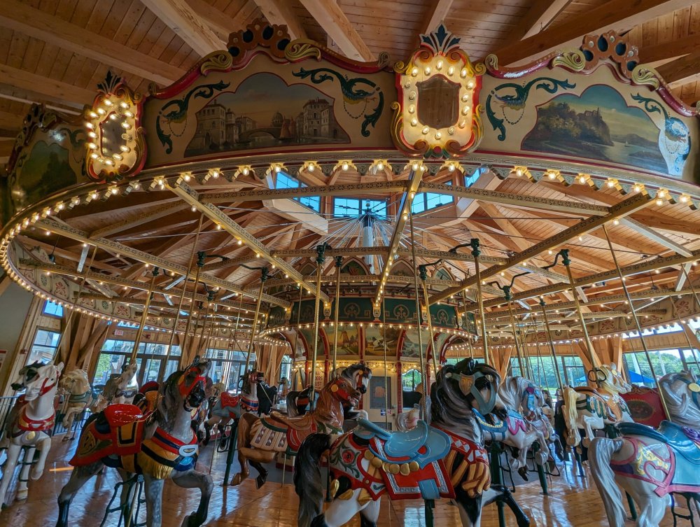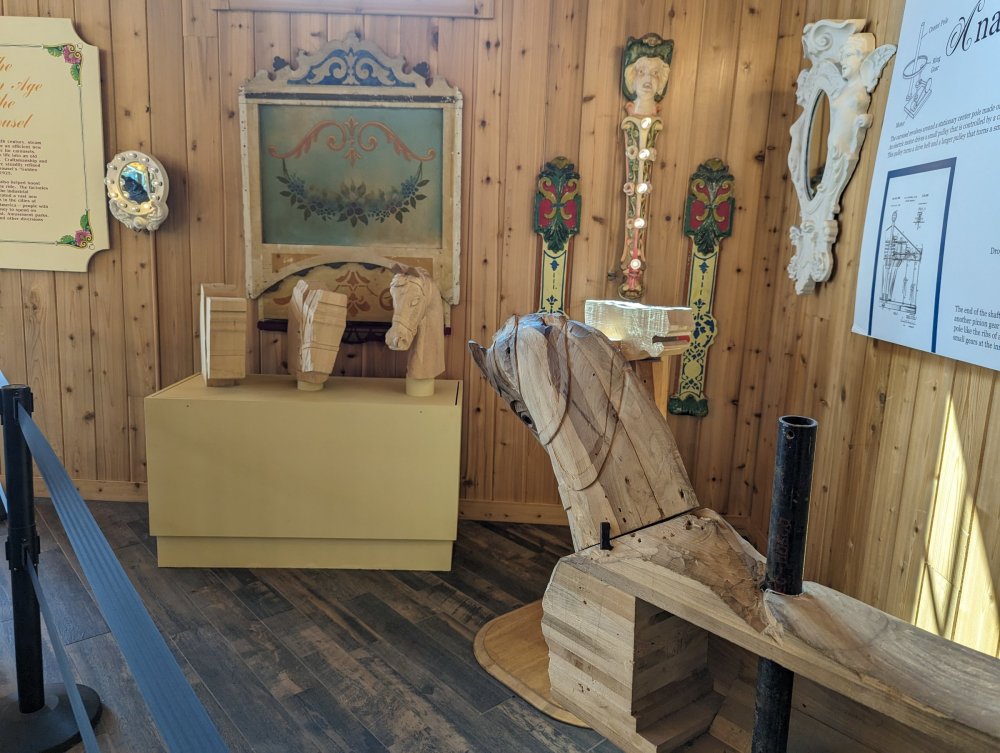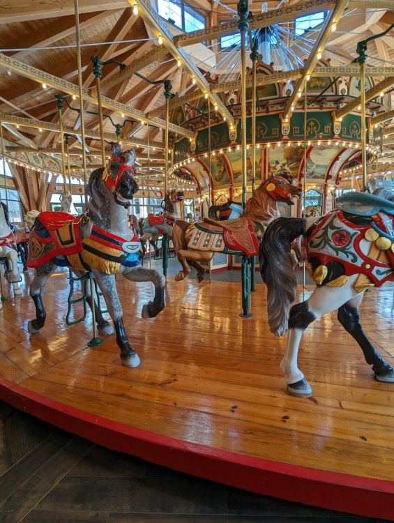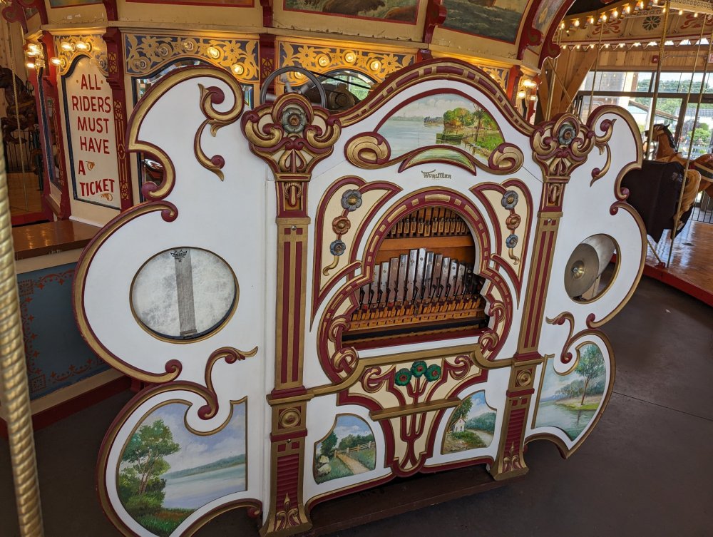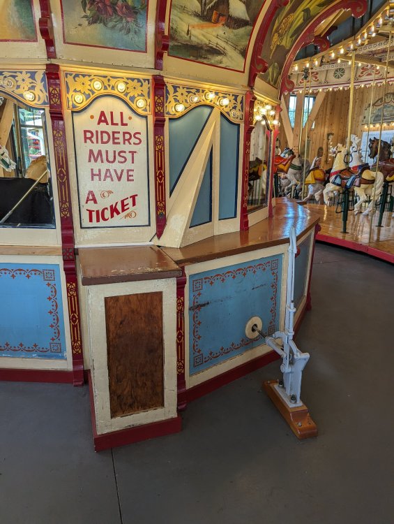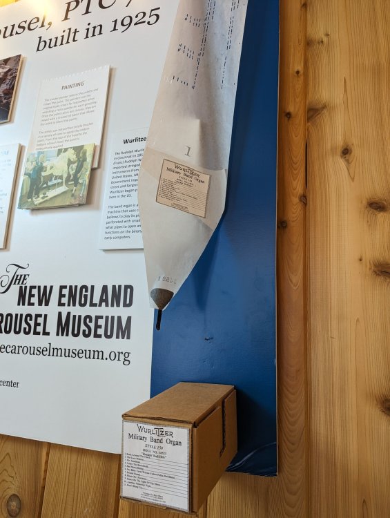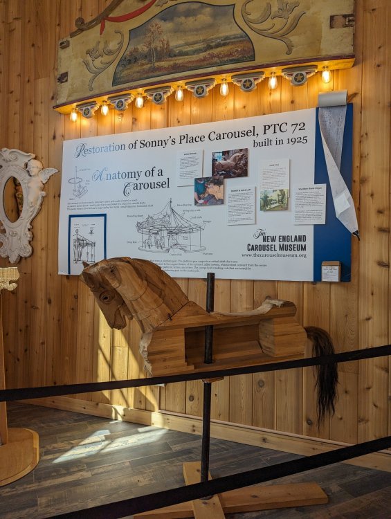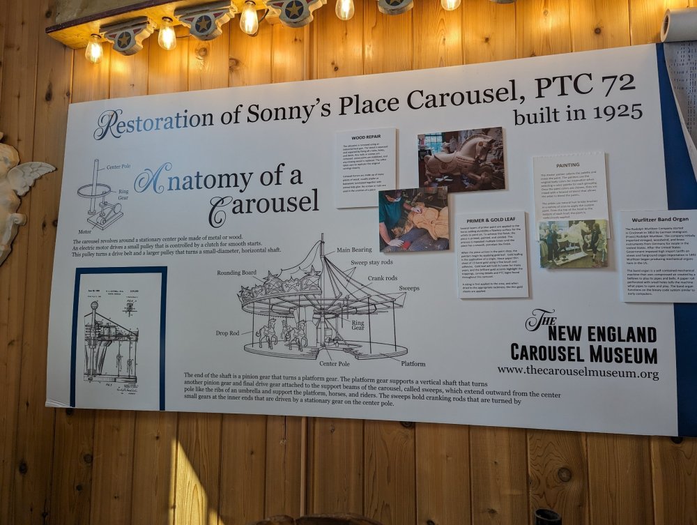 1. Took my teen daughter to our local family entertainment center, Sonny's Place (Somers, CT). I was surprised that their carousel has some historical info setup in the corner courtesy of the New England Carousel Museum. Equally surprised that they are keeping up with maintaining this 1925 beauty! It has zero missing lights (it is indoors, of course), the paint is nearly all perfect with the exception of the bench which is in the process of being repaired, and it has a working (but electrically powered) Wurlitzer!! No piped in music here! Enjoy the pics. I was inspired by Bert riding carousels around the world. ^ The museum itself is near Lake Compounce. Sonny's Place is on the road from my house to SFNE. ^Cool little display of the actual scroll for the band organ. ^Anatomy of a pole dancer ^Nice little corner display. Can't believe no one messes with it! ^Carousel sits in a very nice specially constructed pavilion. ^Horsies ^A holdover control lever from yore ^Music