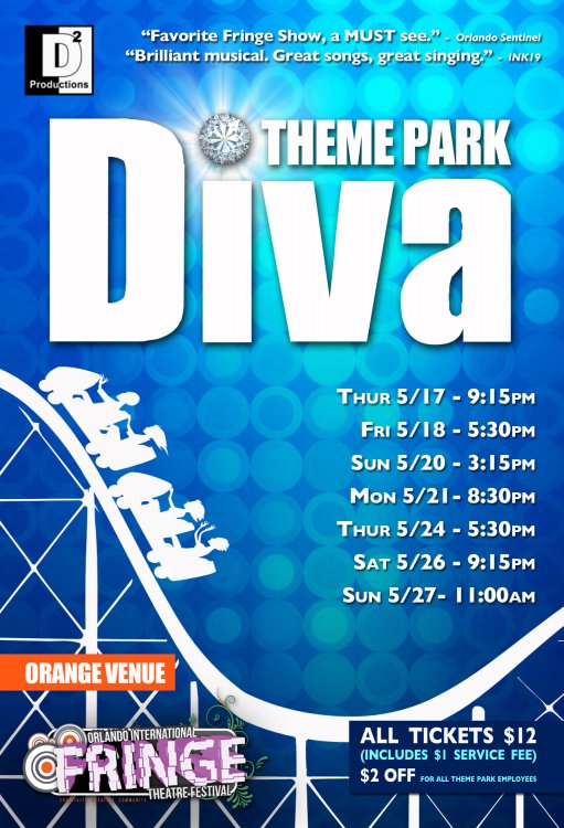 7. Our show logo Hello Orlando TPRers! My musical, Theme Park Diva, will be presented as part of the 2012 Orlando Fringe Festival from May 17-27, 2012. What is Fringe? A 13-day-festival that is founded on the concept of offering 100% unjuried, 100% uncensored, 100% accessible theatre, music, dance, and art to all types and ages where 100% of the box office ticket sales go directly back to the artists within The Fringe. The Orlando Fringe is the longest running Fringe Festival in the United States, celebrating 21 years as “Orlando’s most unique cultural experience”. Orlando Fringe is a proud member of the United States Association of Fringe Festivals (USAFF) http://www.fringefestivals.us and the Canadian Association of Fringe Festivals (CAFF) http://www.fringefestivals.com. Basically, it is theater, dance, music, comedy, and lots of crazy stuff in between. Shows are rated G to R with some shows offering nudity! (Not mine....but we do say "bitch" twice and "ass" once or twice!) For a much more detailed explanation of the Fringe, check out their site: http://orlandofringe.org/how/howto/ My show is a musical about the made-up Galaxy World USA and the cast of the park's BIG show: Music Music Music Music and More! It features a cast of 11 made up of many Disney and Broadway veterans. I first wrote the show back in 1997 as part of the end of season banquet for Busch Gardens VA. I have produced it twice in the past at the Orlando Fringe in 2003 and 2005. I'd love to see you at the show! Tickets are $12 (which included the $1 service fee) and can be purchased online now right here: https://t5.clicknprint.com/Online/?siteID=1421&cartID=42ca013d-f2b1-426a-b09b-24c4114f0b15&eventid= Just scroll down to my show "Theme Park Diva" and pick your date and quantity of tickets. NOTE: I am also offering a $2 discount to all theme park employees. HOWEVER, you can only get this discount if you purchase the tickets in person at the festival. My venue holds 360 people, but I would suggest getting tickets early in case we sell out. Box Office hours on weekdays are 4 PM-Midnight and weekends 10 AM-Midnight. Orlando Fringe Box offices are located in the lower-lobby of The Lowndes Shakespeare Center and the back lobby of The Orlando REP from May 17-27th. Also, you must have a Fringe button to get into any show. This button costs $8 (I think) and you only need to purchase it once. There is also a BEER TENT! And lots and lots of food vendors on the lawn. It's a great place to hang out between shows and talk to other guests about what they liked and didn't like. And for those so inclined, I am looking for sponsors for my show. Basically, I have spent about $3000 of my own money on fees, ads, and other expenses. I have sold ads in my program and raised about $700. If you want to be listed as a sponsor or have your website listed, I am accepting sponsors for $25 a line in my program. Here is the link for that: https://www.paypal.com/cgi-bin/webscr?cmd=_s-xclick&hosted_button_id=GH6M5P2AHCREW Here is a quick link to my original post for the show in 2005: http://www.themeparkreview.com/forum/viewtopic.php?f=4&t=1842&hilit=theme+park+diva Thanks and hope to see you at the Fringe!! Most of the cast with the show poster