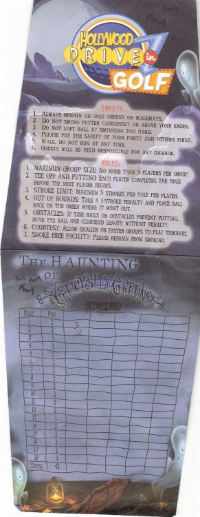 15. Got a chance to check out Hollywood Drive in Golf today at USF. I only did the Haunting of Ghostly Greens course and took lots of pictures. Enjoy! It's open! Prices Rules and some of the Sci Fi side And if you decided to play another round at the end, you can add it here. It is the same price as pre-paying for 36 holes. My score card front Score card back Inside the card (I stopped taking score but got all holes in one!)
