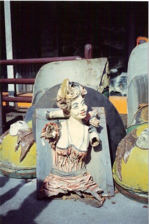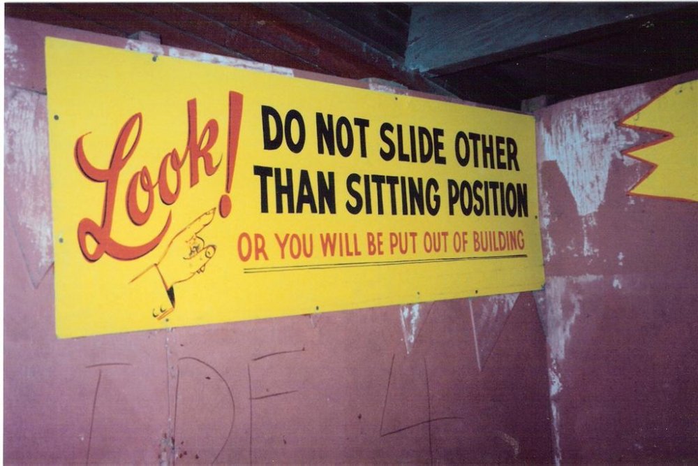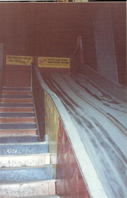Part Two: Auction Day The slide. Notice the dust. I am pretty sure it had been closed for years. OK. I THINK this slide was in the fun house, but it was closed off when the park was open. I discovered it during the auction and snapped a few pics. And strange props Lots of random signs for sale Does this count? : ) The kiddie coaster. I never got this credit. : ( -