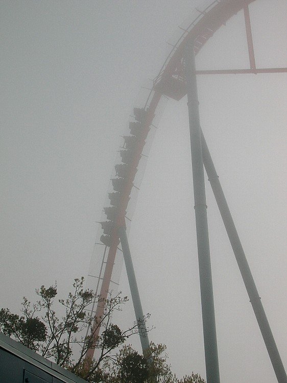 20. Just got back from a weekend trip to Atlanta for a friend's b-day party. As I had some time to kill Sunday morning, and my brand new SFAmerica Season's Pass still in my wallet, I made the 5 minute drive from my friend's house to SFOG! How appropriately named since there was a dense fog all around Sunday morning. The drive was NOT fun, but I arrived in one piece and paid the $15 for the privilege to park. Yeah, it was a rip off, but I got the first row by Georgia Cyclone. I had also read on the Six Flags website that Season Passholders were being allowed to ride Goliath from 9-10am during the first week of operation. Cool! After waiting about 15 minutes at the gate, they let us in and the running of the bulls began! Of course, after a few feet, most of the crowd grew tired and had to walk. I made it to Goliath and got the first train of the day in the front row. The ride ops were not only efficient but courteous as well. Wow, a little kindness does go a long way. The ride was smooth and fun, and the fog helped to make it even more memorable. Personally, I still prefer Apollo's Chariot, but this one was flying along the track. I was hoping the turn around spiral would not be as vicious as Titan or SFMM's Goliath (I always grey out on those) and it was not. Just fun coastering! Had 3 rides within the first 15 minutes then went to explore what of the park was open at 9am. They opened the Scorcher and Cyclone. I waited until 10 to get my credit on the kiddie coaster (Wile E Coyote I think) and was shocked (NOT) to see Deja Vu closed. Oh well, guess I will have to come back this summer to get that credit. The park did seem very clean, and everyone I met from the ride ops to the store clerks to the food op people were very friendly. I only hope this continues throughout the season and throughout the Six Flags chain. Imagine if everyone could be as friendly as the folks at Holiday World. Hey, I can dream can't I Enjoy the pics! Can you say airtime? A view from the skyride Sniff sniff.... I had to find the character whose facial hair would match my camera case! The helix in the fog The Cyclone was running well, and you can see by the half empty train that it was pretty dead at 9am on a Sunday! The characters were EVERYWHERE! Yeah, um, I THINK the Green Lantern forgot his mask. Hmm...that looks like fun! Color me surprised! Hmm....looks sinister! A foggy day....in Atlanta town!