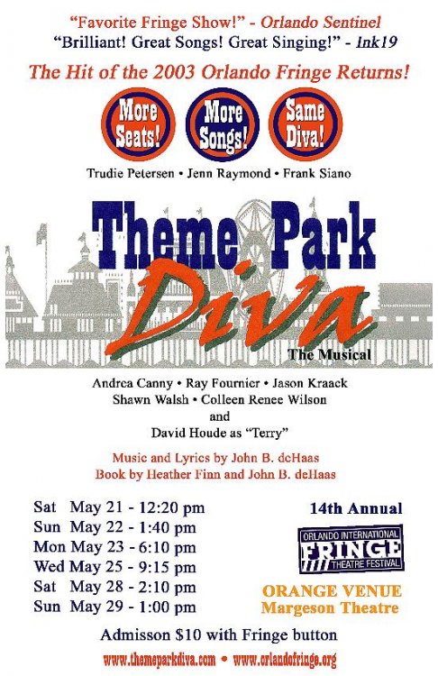 Got an awesome review from the Orlando Sentinel and another mention in the same paper! PLEASE come and see the show!! Thanks! ‘Theme Park Diva: The Musical' By Roger Moore Sentinel Staff Writer May 21, 2005 Theme Park Diva returns to Fringe this year, reaffirming its spot as the one show everybody who's ever worked in a theme park must see. It's about a gal, a gal with a dream, to star in those "click track" musical production numbers at the places Orlando is famous for. It's about a guy, dressed as a gal, who wants to write the best darned theme park production number ever. And it's about as silly and savagely savvy as any one show about theme park "types" has a right to be. John B. deHaas, a veteran of parks from Williamsburg to Japan, co-wrote and composed it and plays the piano as we follow Suzi Ditty (Jenn Raymond, very good) on her climb to the top. That climb must take her past reigning diva Amber Crystal (Trudie Petersen, t-rif). It's a show with tunes about a "family" theme "and all the guys here are gay!" Hel-LO! It's about how the last show of the day is the "fast show," how "cast members" play games with each other, passing off pennies from dancer to dancer, during numbers, to keep from dying of boredom. David Houde is a stitch as Ms. Terry Richards, director and writer of such shows at Galaxy World. Jason Kraack - that's his real name, we looked it up - stands out in a variety of singing, lisping and Spanish-accented roles. See it and you'll pick up a whole new take on park hopping. Remaining performances: 1:40 p.m. Sunday; 6:10 p.m. Monday; 9:15 p.m. Wednesday; 2:10 p.m. Saturday; 1 p.m. next Sunday. FRINGE FESTIVAL Best Bets for Fringe Elizabeth Maupin and Roger Moore Sentinel Staff Writer May 25, 2005 Boy Groove: All the familiar elements to a boy band in a hilarious parody. -- E.M. Dragness of God and the Naked Holy Ghost: Michael Wanzie gives us two nuns, a chain-smoking shrink and a naked man in angel's wings. -- E.M. The Extraordinary Fila: A cross-cultural mix of dueling drummers, belly dancers, a head-mounted candelabra and a live python. -- D.H.B. Eye Candy: Matt Henry makes juggling look cool with a bowling ball, a machete and Kermit the Frog. -- E.M. Kama Sutra: Two 50ish bumblers find a way to spice up their tired marriage. -- E.M. Labrador/The Slip-Knot/Maxim & Cosmo: T.J. Dawe weaves plainspoken magic in three different monologues. -- E.M. Maudlin Dementia Returns to the Stage: A dotty actress meets sex, lies and Shakespeare. -- R.S.V. The Miss Sammy Show: A film of a typical day in the life of Orlando's blithely glamorous celeb Miss Sammy. -- E.M. One Frigid Shiny Knight: Storyteller Randy Rutherford on Alaska, folksingers and folksingers' girlfriends. -- E.M. Theme Park Diva: A guy and a gal with a dream want to do the best theme-park musical ever. Copyright © 2005, Orlando Sentinel |