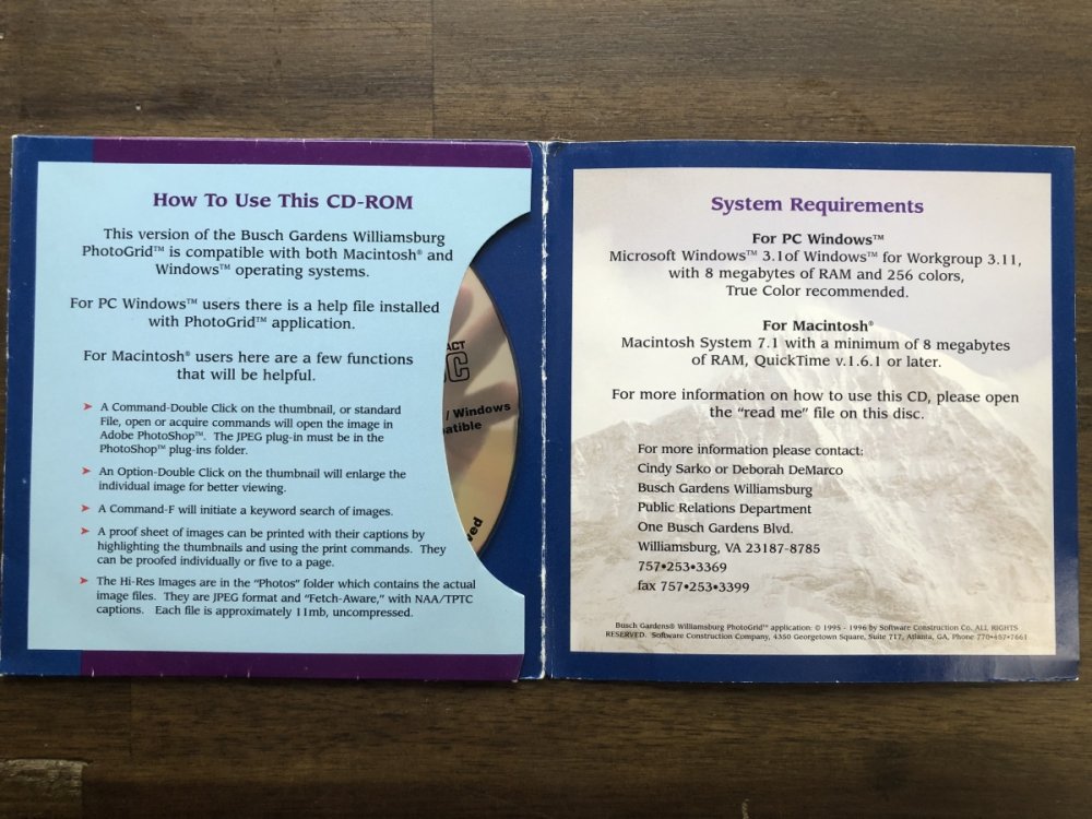 While stuck at home, I found this 1997 Press Kit CD from BGW. LOTS of pics of defunct rides so enjoy! The cover The back cover Check out the requirements! I hope I have Windows 3.1 Remember this 3D movie? 4th row back in the yellow tank top. Yeah. That's me. We had to ride it 9X for this press shoot. AWFUL!!