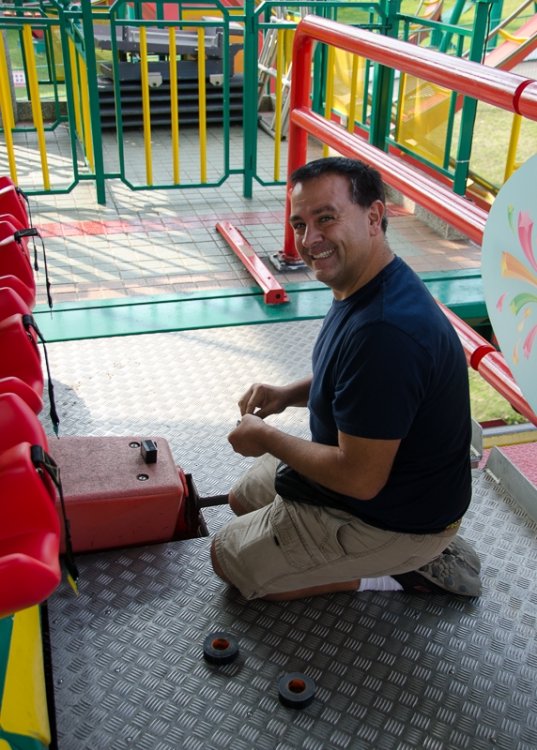 Yeh, that spinner was frankly nervewracking. It span like crazy. It was worrying as you really couldn't see much of the track layout from the pathway. I don;t think anyone did buy it unfortunately and it didn't have any batteries in it so we couldn't test it out. The flume was closed all day for maintenance or something so we had to bypass that one. Not sure what the dark ride was as I didn't see one. The roller skater indoors was called "Dark Ride" though.