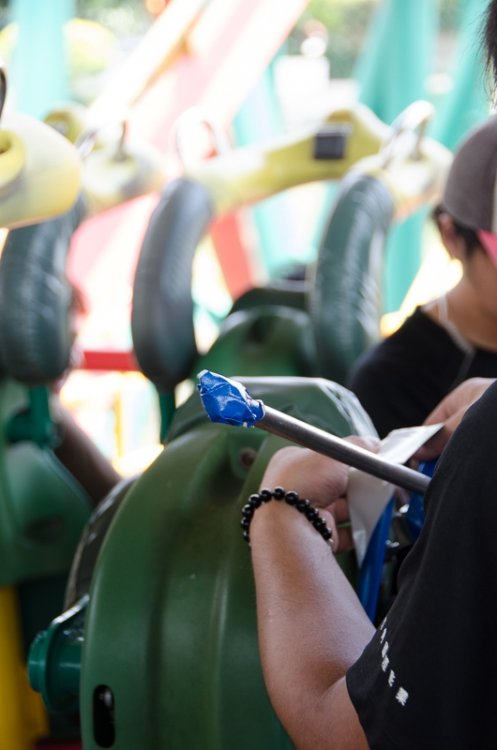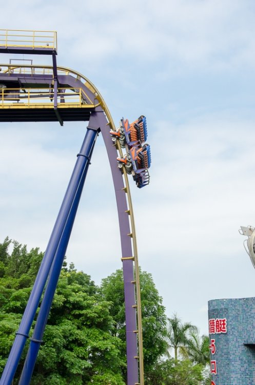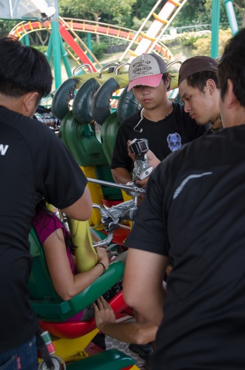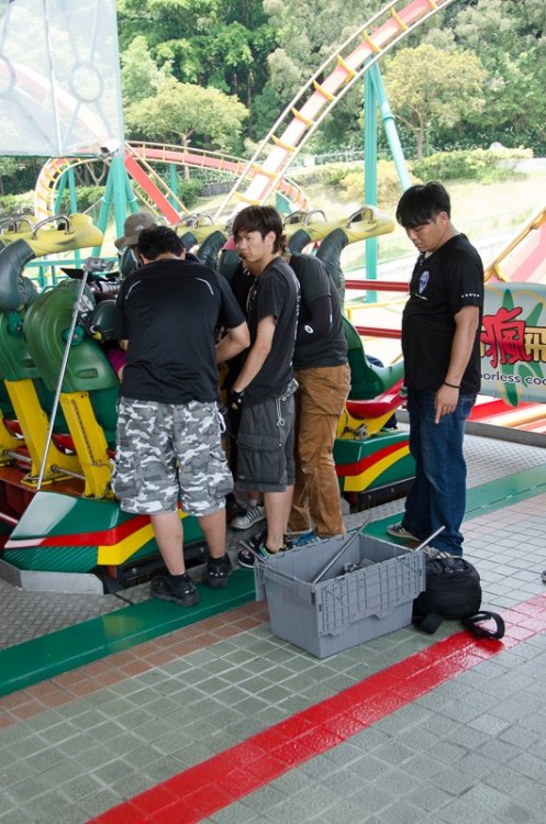 So day 3 was at Janfusun Fancyworld. This park is quite in the middle of nowhere and surprisingly is home to Taiwan's 2 B&M roller coasters: A Floorless and a Dive Machine. We set off early from the hotel with a breakfast box and hit the park extremely early due to the fact that we were meant to be meeting up with the Travel Channel to perform some filming on one of the coasters. We arrived at the Fancyworld hotel to wait for the parks media person who then let us follow her on her moped straight to Insane Speed, the aforementioned B&M floorless. Our first view of INSANE SPEEEEED! The ferris wheel here has 2 modes of operation, today was the insane crazy mode! At least they got the type right in the name! The view from the station platform We were waiting on the platform before the Travel Channel arrived so Robb thought why not stop wasting time and get a few rides in and filming for TPR done in one fell swoop. Robb mounting the GoPro's Partially empty trains making the morning rounds We had a couple of rides and Robb got ALL his filming done in 1 cycle of the ride! GO ROBB! The coaster itself was an awesome little ride, smooth and a good number of inversions. Just a typical floorless coaster really. I just dread to think how many times I rode it and how many of those rides were my first ever go! The trip tried to confuse everybody by consisting of two "Keiths" Travel Channel arrive and start their hour and a half setup. At this point Robb persuaded them to allow us to wander off around the park to ride their other B&M and be back quickly ready for filming. The cavalry arrives. Vicky the Viking was overly present in this park The giant Starwa... Sorry... "Hill Escalator" nicely warned us to be aware of Sharks. This sort of looks slightly familiar G5!!! DON'T LOOK DOWN!!!!!!! G5 was the parks B&M Dive Machine. G5 is an exact mirror image clone of Oblivion at Alton Towers, UK. It was also much warmer to ride than Oblivion, had a much nicer colour scheme than Oblivion and had no queue! But we did manage to shout the typical "DON'T LOOK DOWN" catchphrase from the top! Remember, Welcome to Oblivion!, wait, err... no, Welcome to G5!!!!! Duh Duh Duhhhh!!!! Awesome view from the viewing platform. why can't Oblivion have this? On the way back to more Insaaaaanely speeedyness I managed to get a glimpse of other attractions that the park had including the big indoor area that we all thought must be at least be air conditioned and turned out not to be. This building was also the station of the KuKu Coaster, the parks little powered coaster. A set of S&S towers Just incase you thought that the park was closed on the day we went to make way for all the filming going on. Nope, the park was fully open and totally empty. I would say there we less than 100 guests in the entire place! and that can include our group and the small group of "extras" that the Taiwanese filming company brought in the fill up Insane Speed. This is where we are, just so we don't forget Janfusun Fancyworld also had this weird attraction which I wanted to try out but it was down and looked totally down and out. I was told it would be a ride once and never again type of flat. Back at Insane Speed, the film crew were still fiddling around and getting different shots: Anth was looking surprisingly cheerful considering the pole, that had just appeared from the contraption they were building on Elissa's seat just infront of it, was pointing straight at his face. Will I survive? - Yep, He did Anth is all well and good The said pole. The film crew then decided that "oh this pole doesn't seem very safe to me, let's fix that by covering the end with a tiny bit of blue tape. That'll keep Anth safe enough." Pole of doom And this is what they built onto Elissa's seat as she sat there for a very long time just to hold a GoPro just off to the side. It was tremendously hot and humid so one of the crew kept getting her bottles of water and wafting her with a plastic sheet to keep her cool! Saw Death Trap Contraption The park had a very nice (but very empty) waterpark The Starwa....Hill Escalator, I'll get this right eventually. G5! - At least you don't forget it's name Speeeedy! Robb wanted shots of the ride but as the park was empty, Anth was sent to keep riding just so some video could be taken. I think a few others joined him for this ride though. I'm on TV!!!!!! after our supposedly 1 ride on Insane Speed, we voted to give our thoughts using the iPad's set up just outside the ride. The voting! What did we think? Well you'll have to wait to find out After more Travel Channel things, I got to spend a small amount of time wandering around the upper section of the park. Up there was a coffee museum that was delightful in two ways: 1. It smelt of coffee and 2. It was wonderfully air conditioned. There was also a small haunted walkthrough with a stab in the back preshow. I apologise profusely to Miles for this walkthrough! After leaving Janfusun Fancyworld we made our way to our next hotel which was situated right next to Sun Moon Lake. Sun Moon Lake has a cycle path around it which is apparently one of the top 10 cycle paths in the world according to Michelle. It was a beautiful area and had stunning views across the lake and the hills beyond. Bitter Nut Trees Sun Moon Lake I think Anth is hungry. Yumm Night view from room balcony Our next park is Formosan Aboriginal Culture Village situated about 15 minutes from our hotel here. I know what you are thinking, oh no, a culture park. Wait! It was a surprise to us as to what awaited us and it was an awesome day overall, but that's all for next time. See you all then!
