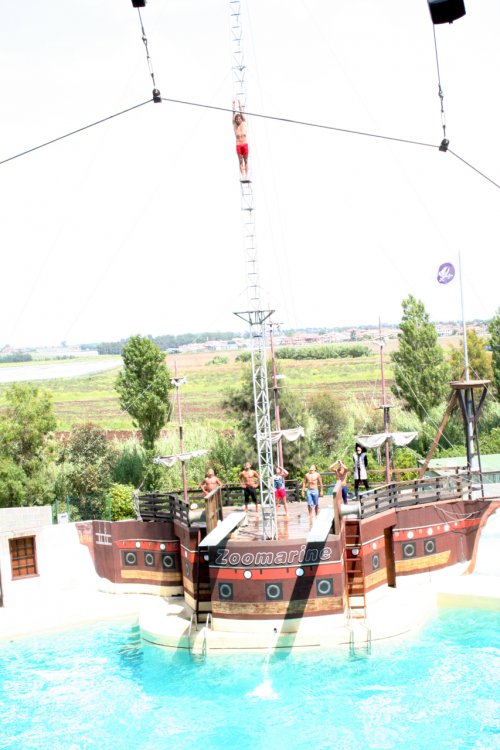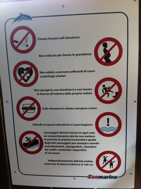 I've seen advertisements all around where I live for a park called ZooMarine, located near Rome. I did a little bit of research into the park and found it to have some nice things to do. The park has several animal and water shows with a water park and few rides inbetween, including a Schwarzkoph Looping Star that's traveled all around Europe. For Memorial Day weekend, we visited some friends of ours that live in Rome, and we checked out quite a bit of the city, as well as ZooMarine. First off, here are some photos from our day at ZooMarine. We've arrived at the tents of ZooMarine! Here's my ticket to fun! Dad approves of this Jurassic Park ripoff. I think this is a relatively new attraction. It's some kind of exhibit on dinosaurs. "I like pleasure spiked with pain and music is my aeroplane. It's my aeroplane." What could this tent be for? Looked over a fence and saw the park attempting to hide parts for a new Aquatrax! Many of the restrooms at the park felt kinda portable and like they were just plopped in their locations without much thought. OMG! Dinoman! We grabbed a little snack at the cafe at the front of the park. The ladies who worked there were very nice, spoke good English and gave us good service! Nutella Crepes are always awesome! Here's the way to the rest of the park. Here's the park's 'Wacky Whale'. Almost sounds like the Italian word for squirrel! Octopus and water slides. It's kinda like the slide ride you can get on Roller Coaster Tycoon games. Kiddie swing ride. Not the most scenic canal to have run through a theme park. Here's the little waterpark section. It's definitely a nice thing to have in Italy during the hot summers. Now we've reached perhaps the most exciting ride at the park: Vertigo! Nice first drop. Too bad it's not opening until a little later. So for now, let's go watch the dolphin show! "What is it with European theme parks having such catchy theme songs? Zoozoozoomariiiinnee!" Flying dolphins! They can jump over each other! Underwater circle! They flip! They fly! They touch the sky! Tail SWWIIISSSHHHHHhhhhhhh! The dolphin show was great! It was one of the best theme park dolphin shows I've ever seen, and it's certainly a highlight of the park! It's finally time to ride! This definitely seems like a traveling coaster, and it actually is! This is nowhere near the first park to have owned Vertigo. Train shot. Literally! The station is very simple. Orange is a good Schwarzkoph color. After we got a few rides on Vertigo, we headed to the bird show. It's mostly educational, informing a building designer about why she shouldn't build her new skyscraper in the rainforest. Fly-action! This one was pretty loud after the show! These guys have big bills! Hmm... so Gardaland's mammoth escaped to ZooMarine! Ah, so we've run into a new addition! I'm guessing that, come next year, this section may attempt to unite the park's scattered pirate theming. What the heck is this thing?!? We noticed all of this white stuff on the ground... bird feathers or did we just miss a snowstorm in Rome? You decide! Are you ready for the 4D Cinema? It was actually pretty terrible! Old effects, terrible 3D vision that irritated my eyes, and a rather strange story. Time for some more loop action! Onride photo of me! Brace for the brakes! Here's out midday snack. Next up, the park's high dive show! Highest dive of the show! They have an underwater viewing area that shows some of the sea lions and other animals! Mom and I took on the slide! It goes reasonably fast, but you don't get very wet. The kiddie drop tower was pretty fun! Dad and I rode it several times in a row! Small drop towers with lots of airtime make me do weird things. AHHH! THE WHALE'S EATING ME! Next up, the log flume. Ok, so on this ride, I can't smoke, be a fat woman, like Switzerland, fall backwards down stairs, eat a hamburger, dance while in the log, or leave people stranded. And I might also get wet. This ride has 3 lift hills! Here are 2 of them. Finally, it's time for the CSI: Sea Lion show! They tried to figure out who stole some fish from the sea lions. I felt that the show would be better if it had some more action. It seemed to be mostly talking and not much movement. Last minute stop in the park's main gift shop! Wonder if there's a real owl or eagle hiding in there somewhere... And that was our day at ZooMarine! Coming up soon is our day in Rome and Vatican City!