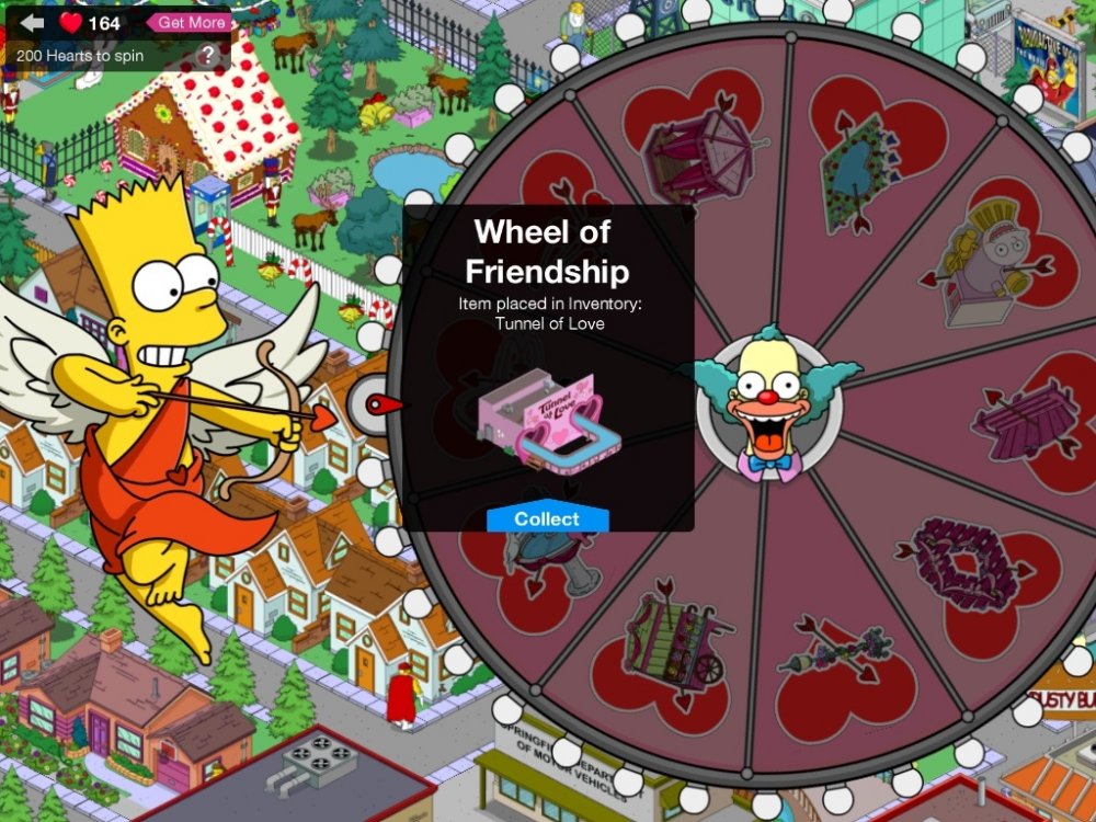 Thanks for the heads-up! Did some looking around. Just like the individual prizes before, you can use donuts to speed up the actions. But why? It looks as if the award goals are reasonable. It's been reported as: Prize 1 - Olmec Head- 1000FP Prize 2 - The Singing Sirloin - 2000FP Prize 3 - Snowball II -1000FP Prize 4 - Homer's Car - 2000FP Prize 5 - Stampy - 5000FP The are also a couple of peeps who have tasks when the Singing Sirloin is built, and Stampy has 2 tasks!! Also, when you graffiti someone else's town, they get FP (Friend Points) when they clean it. (Drawback - it does affect yours/their righteousness rating). Fortunately, the people who haven't completed the wheel can still collect hearts, just not from those who have updated. That's all I know as of now. EDIT TO ADD: You do NOT have to tap on the FP to collect them (like you did the hearts), just tap and move to the next town. Much faster, and quits being too boring.