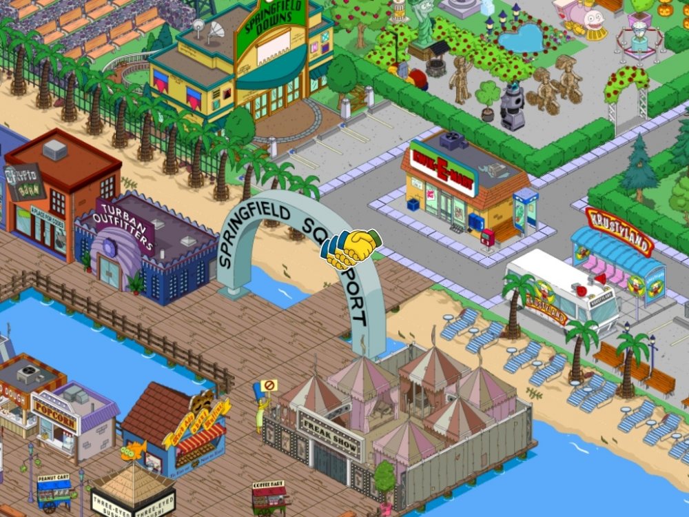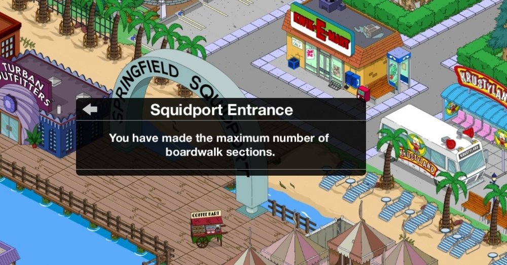 Apparently, the glitch has also been discovered to also include massive XP for those tapping on their friends' completed 24hr tasks of the "Open Air Stage" by Hans Molemen (Man being hit by football: The Musical), "Channel 6 Studios"' with 24hr tasks by Brockman, BumbleBee Man, or Arnie Pye, and Cleteus' Farm with Cleteus task or brewing moonshine. The thoughts about the priority of fixing this glitch is starting to become quite varied. On one hand - since the items available for Squidport have tapered off quite a bit, and not part of any main story lines, they will let it slide. At least for the duration of the current TV season. Too many things to tie into in a short time (thanksgiving, Christmas, New Year's, Valentines Day). On the other hand - Squidport is such a large territory, that its being used as a filler, during lags in updates, completed promotions (whacking day, Halloween, etc.). That's why we got the sushi place, and a couple of other things. It is like a sidegame, like Krusytyland (even though SP is connected to the main screen) to keep up interest in the game. And it's costing EA donuts. In my case (as is with most people here) - we are at that 2.5 day build of the tiles. To speed it up, 30 donuts. There are people who will spend the $$ to get the donuts to speed that up. (There is also speculation that the donut price is so high to speed things up, AND some premium items, is to burn up the 1000's of donuts some people got off previous glitches. Evidenced by reduced prices 6 months later (Springfield sign, etc..)). I tend to think with the latter camp in thinking that the glitch will be fixed quickly. I mean I got 7 tiles yesterday. That's 210 donuts, and in terms of real money (best case scenario, boatload of 2400 donuts for $99.99), I saved $8.75. Along the rumor mill: A holiday tie-in for the Jewish temple with Krusty's father, Rabbi Krustofsky, as well as Snowball II. Springfield mall tie-in with Black Friday (though it may be a "sale" of items like the cigarette machine, the Duff bus etc.. that we had earlier this year) Courthouse with some Judge Snyder and Blue-Haired Lawyer. Harm's Houseboat with Judge Constance Harm I Cant Believe its a Law Firm! with Lionel Hutz Artie Ziff Still talking about: Crazy Cat Lady Jacqueline Bouvier .done with the homework for awhile.
