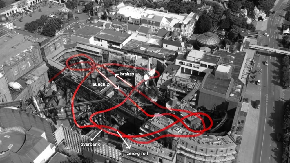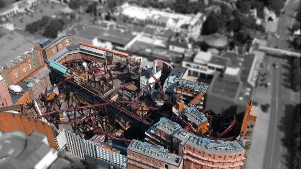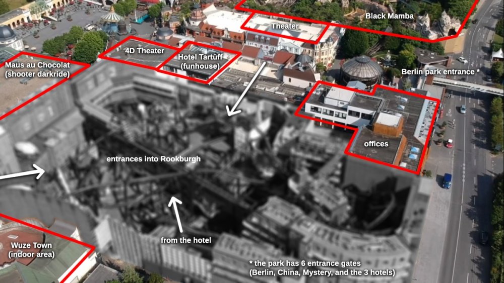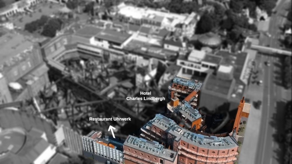 Using this screenshot, I made a couple quick edits which should help all of you understand this confusing area. Let's start with Rookburgh as a whole. This is all brand new: This belongs to the hotel: To give you a sense of scale: Now let's take a look at the coaster. From what we know, there will be separate load and unload stations, and there's also a short lifthill. Oh, and in case you forgot, the seats on this ride can rotate. You'll board the train seated upright like in a normal coaster, with the track behind your back. As the train starts to move, you'll basically be going sideways. At the top of the lifthill, the seats rotate 90° to align you with the track. Fellow member MrRC made a NoLimits animation of this (link): Here's where all of this is hidden away. The station is underground, the lifthill is enclosed: Then you're launched into the first half of the ride. Notable elements: - launch - overbank - zero-g roll - fly under the railroad drawbridge - fly through the balloon storage - fly over the area in a large figure 8 shape The second half starts with an underground launch, and is considerably more hidden. Notable elements: - underground launch - steep uphill - overbank over the restaurant - tight helix - zero-g roll over the restaurant -
