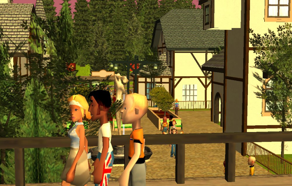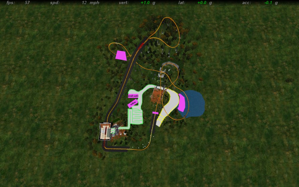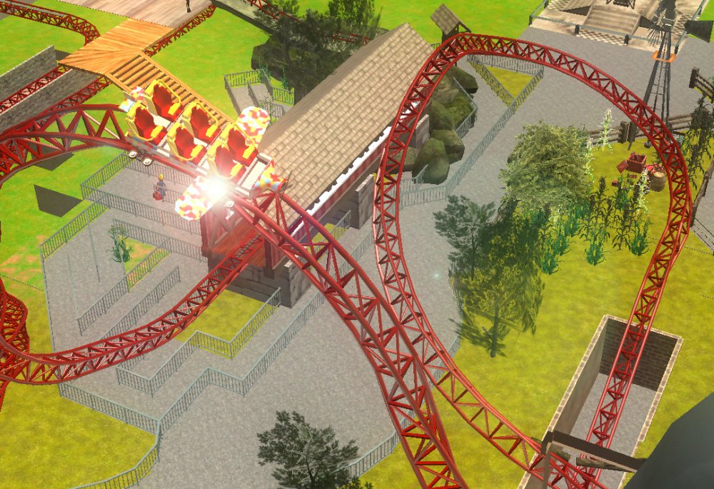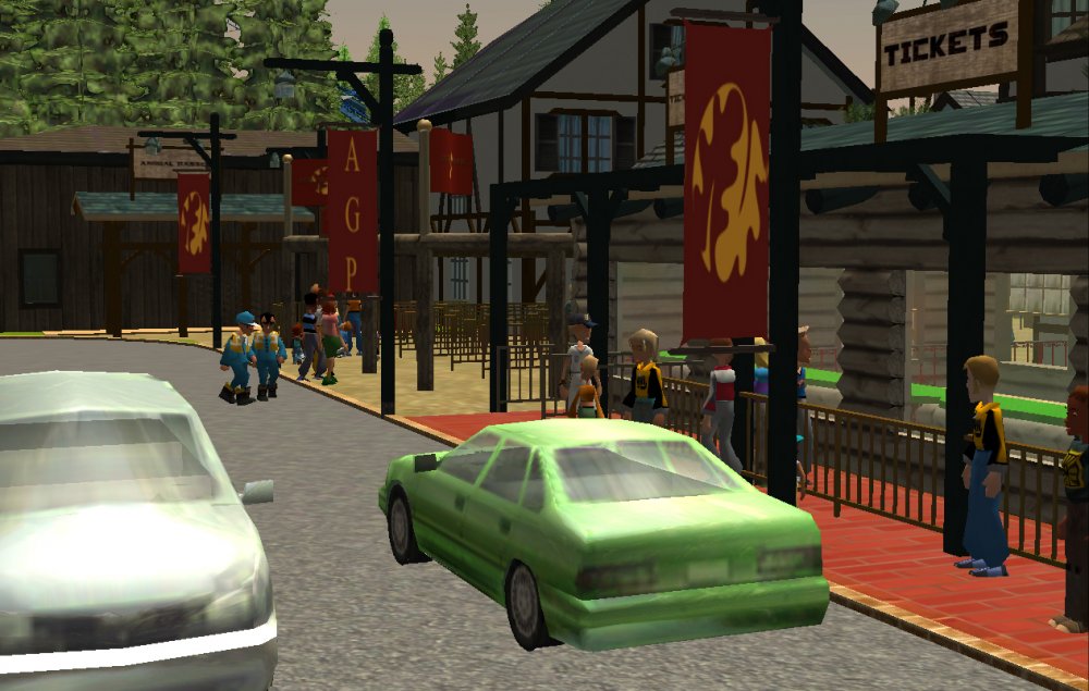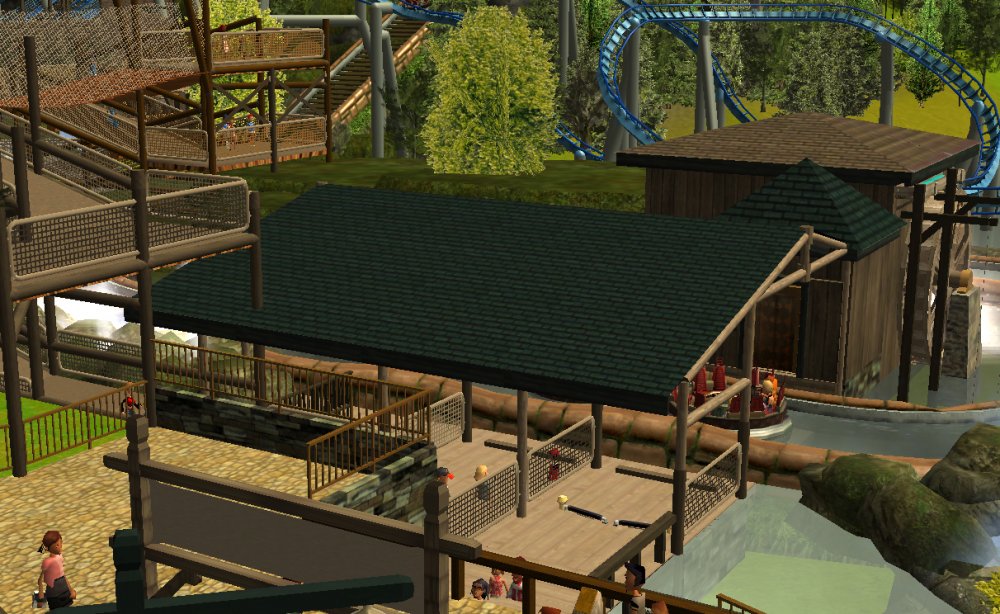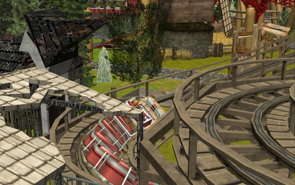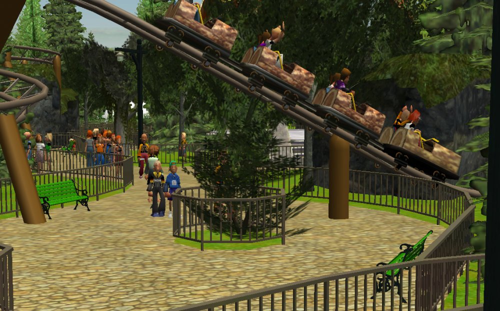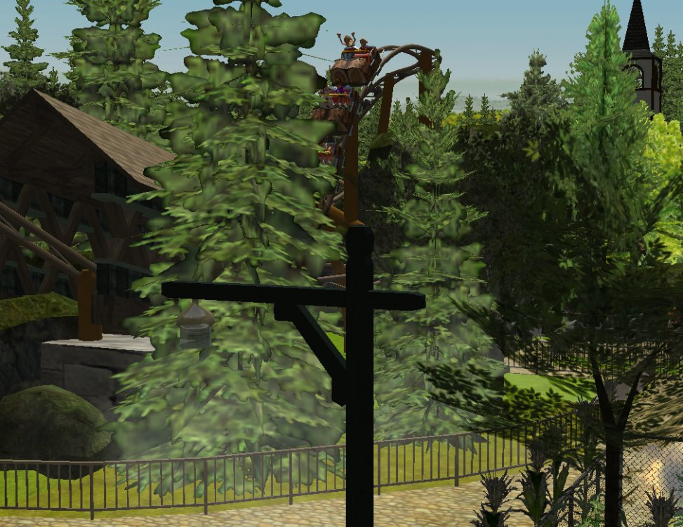 [RCT3] Ash Grove Parkrollerross45 replied to rollerross45's topic in Roller Coaster Games, Models, and Other Randomness Sorry to Double Post just this is a big update so i thought i would give it a little nudge. After The ERT we heeded straight to the entrance for the opening ceremony. The park opening ceremony was about to begin sorry for the bad quality but i used my cell phone for this one, the bell tower strikes noon. confetti was blasted out and we then went in As we went through we walked though Grove Plaza, An Alpine Village Settled at the base of Eagle Piste. First ride I went on was LumberJack Based in Grove Plaza its a Family Coaster that flys round the trees and lakes. It got busy very quickly. Grove Plaza as seen from LumberJacks queue bridge. LumberJack Crosses over the main path 3 times before going under the queue line bridge. The first drop of LumberJack is perfect for little children and family members all alike. I headed straight to BarnStormer as it was the near to LumberJack, The queue was only 20mins so I Hopped on. a few empty cars went round due to some technical hiccups, typical opening teething. The inverted/Over-banked turn The banked top Hat just after the first launch I then noticed the queues got long; 3 hours for Hawks Flight, 2 Hours for Eagle Piste Thunder Rapids and `Many flats had 30mins to 1hour, perhaps the staff as being new were unsure how to batch efficiently or it was opening day hype but i couldn't be bothered to stand around queuing, instead i filmed some of CalamityVille from my RC helicopter and also uploaded POVs from Barnstormer and The Twister.