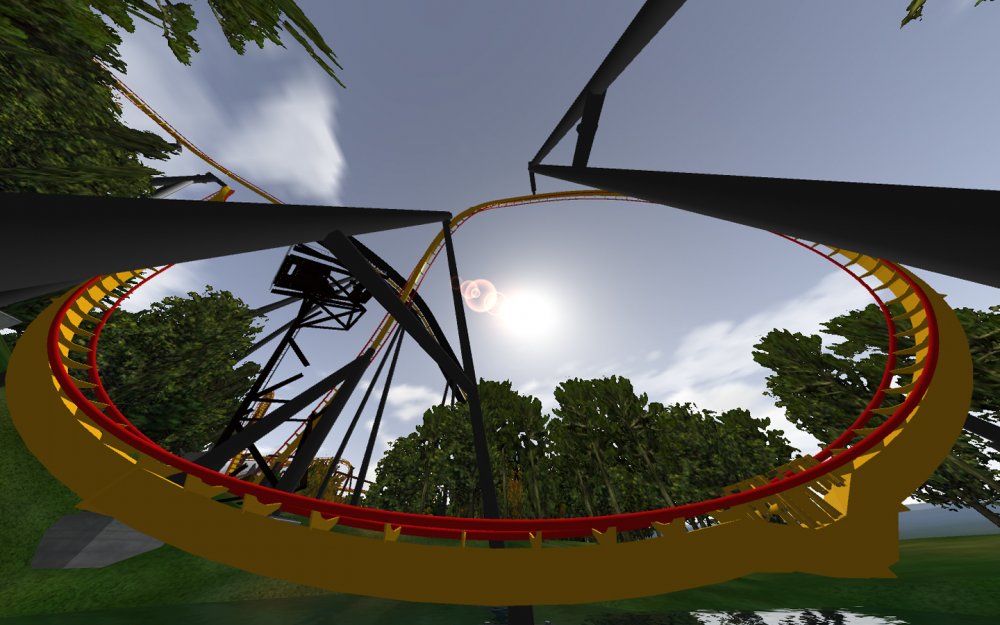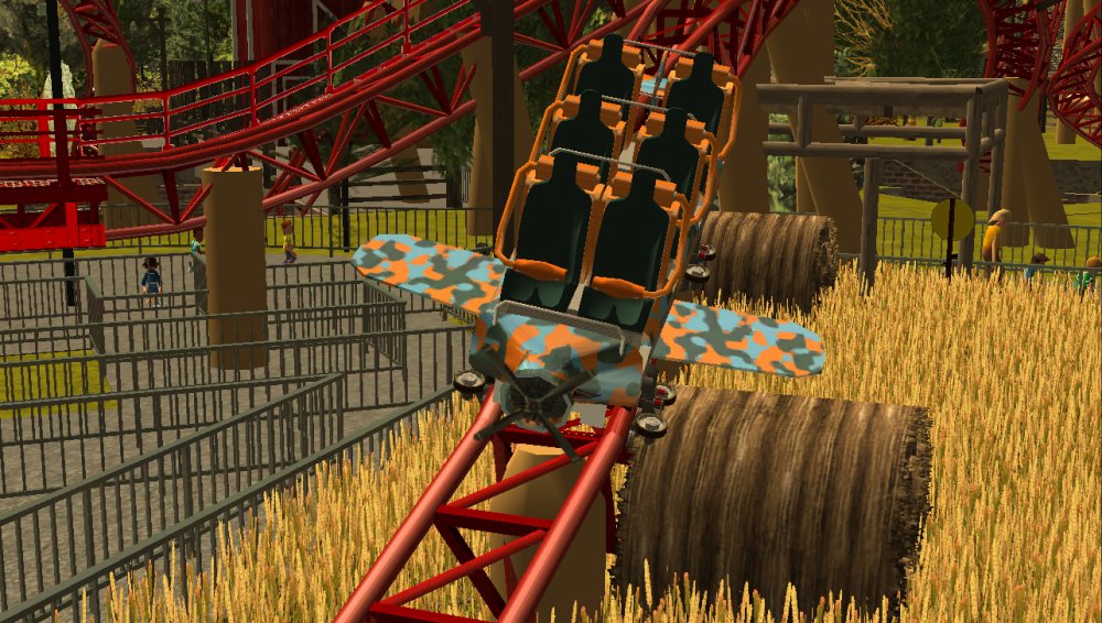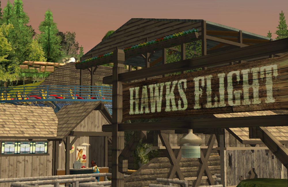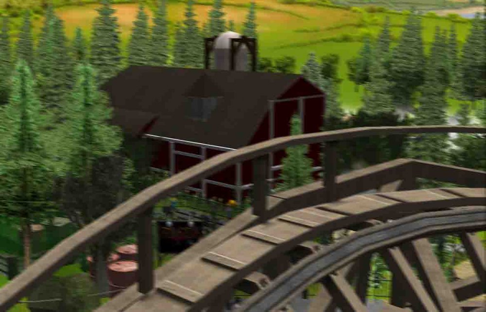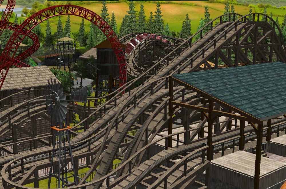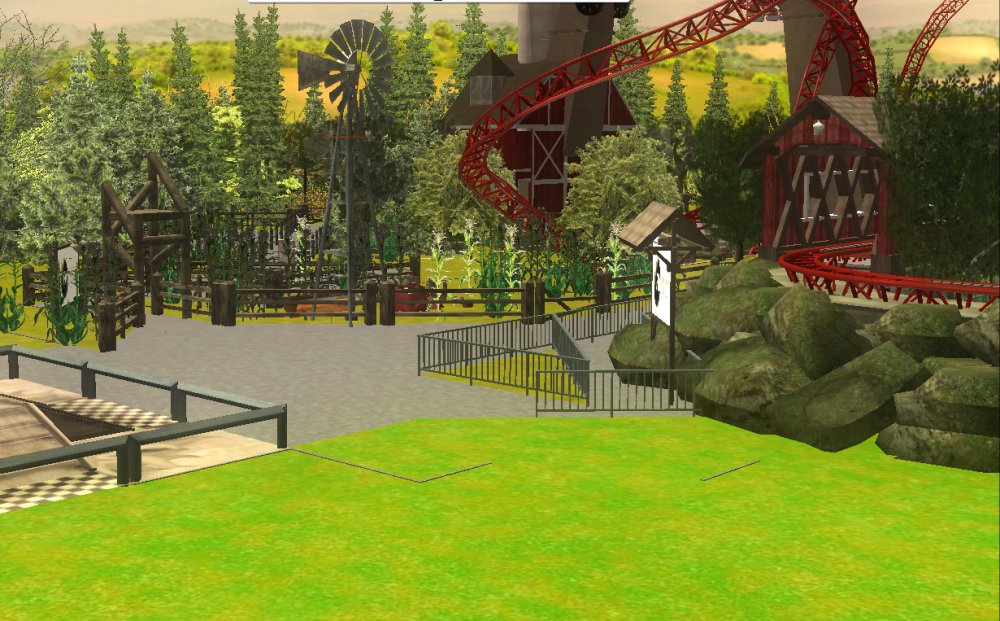 So I started working on some coaster designs and area plans and decided i would make a park now i have finished school, Ash Grove Park is currently in 2 areas, CalamityVille and Eagle Piste. CalamityVille is a small farming town that in one end has been devastated by a recent twister. Twister the Family Friendly Wooden coaster, Whilst BarnStormer a multi Launched coaster, CalamityVille SwingShot a S&S Screaming Swing and A Drop tower with an unknown name. CalamityVille SwingShot and the Drop tower BarnStormer CalamityVille at the moment. Eagle Piste Currently has Hawk Flight a B&M WingRider that interacts and flies around WaterMill Rapids, Expect to have 2 more flat rides and a chairlift. Eagle Piste Hawk Flight Panoramic View of Eagle Piste