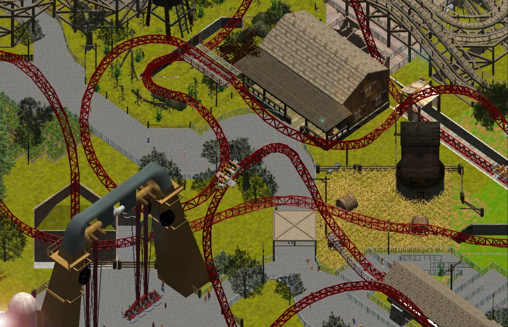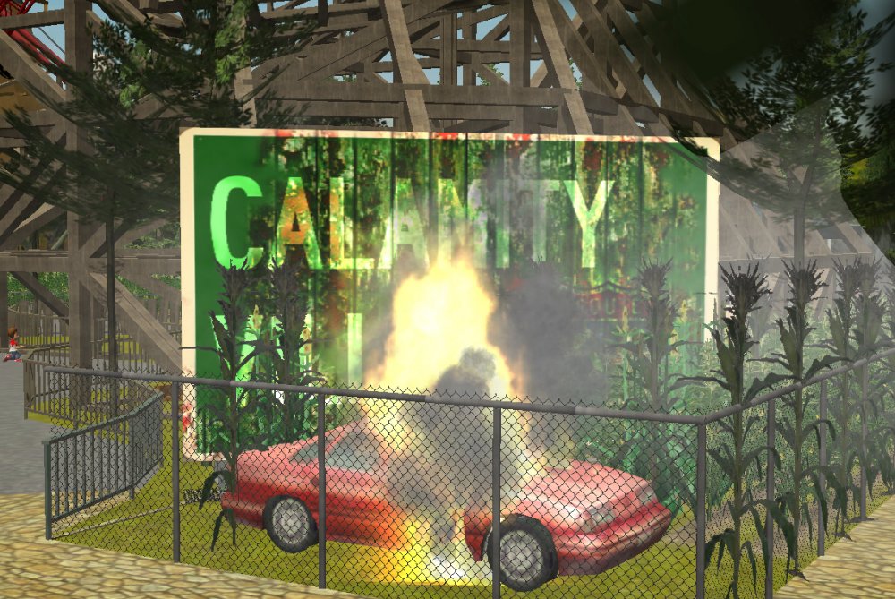 [RCT3] Ash Grove Parkrollerross45 replied to rollerross45's topic in Roller Coaster Games, Models, and Other Randomness Sorry To Double Post, But I've been travelling a lot which has meant long car journeys with nothing to do so I went on my laptop and have done some more of Ash Grove Park. In my next update i hope to continue as if it was a story of a park, so sorry for these Work In progress posts. NOw heres a 95% complete CalamityVille. Twister is the first attraction to come across as you enter, The large road sign for CalmityVille opens us up into 2 ways to enter CalamityVille. The large road sign for CalmityVille with the devastation of the twister leaving a flaming car behind. 1 way is towards The Twister, the family friendly wooden coaster that sure packs a punch of airtime and speedy hairpin turns. The near miss at the bottom of The Twisters main drop. mid shot of the twister station and lift hill. The other way takes you to the Junkyard Playground, A kids play area with slides and water sprayers. A view from the top of one of the slides. The Saloon cafe and The junkyard play area. Finally in the main section of ClamityVille We have Barnstormer, Barn Swing'r , Slingshot and Free-faller. isometric shot of the overview of Calamity Ville. CalamityVille Main Street. Eagle Piste is still no where near finished and theres still supporting for both Barnstormer and Hawks FLight to do, Next update will be opening day and from there on i play it on a more story based way. Free-Faller Entrance