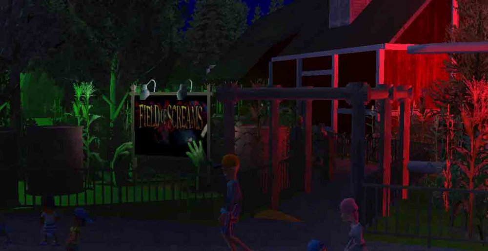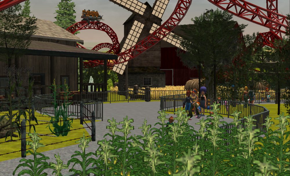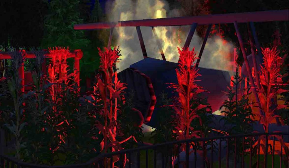 [RCT3] Ash Grove Parkrollerross45 replied to rollerross45's topic in Roller Coaster Games, Models, and Other Randomness The season is 2013, Were here at the Premier Screaming Night for Field Of Screams Live, The walkthrough Horror Attraction opening in the Calamity-Ville Section of the park. I arrived at 6pm where it was still light and the attraction wasn't open, So whilst I waited till Dusk for the park to opening the night open only attraction, I got some daytime pictures from nearby attractions Eagles Claw and The Twister. The New attraction fits in-between the entrance to Calamity Ville and The queue for Eagles Claw. A shot of the overview of Field Of Screams From Eagles Claw. The Barn can be seen clearly from The Twister Got this from Eagles Claw Queue, Theres plenty of Corn. Shortly Night Fell, The area was soon lit up with patches of green and red lighting and fog machines, a loud scream was heard to announce the opening. We went in and the storyline is explained as we queued for around 30mins. As night fell the eerie redly lit corn and fire struck plan light up the way to field of screams. The entrance to the attraction. The queue line is all dim lit and eerie looking The Tvs explain the story, The reason for a recent zombie outbreak in CalmityVille is due to a newly tested fertiliser was meant to preserve food for eternity, However the fertiliser plane was hit by lightning and crashed into the water tower and nearby corn fields. This lead to the contagious substance getting into the food and water of CalmityVille residence. CalmityVille is currently under Quarantine but can you survive until you can leave or will the infected get you. The attraction started off inside the barn you turn right into a small room, an actor in a farming outfit ran in, screaming "stay together they're coming etc…. Make sure you stay in here unless I say so" . the lights dimmed and the 4 TV’s placed around the room flicker, static is shown edited with news clips of the zombie outbreak , out of nowhere the farmer actor comes back again, this time in front of the doorway, "Ill keep them back, just get out of here now get into the field and hide", He is then pulled from the doorway and the lights go off. Flashes of lights occur every 2 or 3 seconds with zombies appearing at the doorway, you are then chased out into the field. A loud sound of a plane passing overhead with a loud bang, plays as you exit the barn, we walked further into the field and started to hear the corn rustling as hands from below grab you're legs as you walk by. We then slowly turned down into a straight section, which was covered in blood stained sheets and laundry. Behind one of the sheets a zombie version of the farmer from the first scene, which chased us round the corner into a few turns. The next section featured a small outhouse; The outhouse is destroyed, opening up the room to intruders. Inside is some kitchen items and a bed, the Washing machine in the outhouse flings open as a zombie crawls out, the bed next to it shakes. Strobe flickers as someone leaps from the bed towards our group hissing in our ears, growling and grunting. We then went round the back of the outhouse, were child's music starts playing, a little girl stands back facing us, we then walked closer and closer as she slowly turns round, all zombified she sands there tilts her head then screeches and running towards us. With her burnt and bloodied Barbie doll, she strokes you're hair and she sang in an eerie fashion to some other members to our group. We then walked round the corner back towards the barn; We then stopped as 2 large metal doors meant we couldn't enter. But shortly after being stuck, the loud noise of the chainsaw could be heard from behind us, out of no where a zombie actor with a chainsaw chases us back into the barn. Sadly i wasn't able to shoot a POV video but sneakily got my camera inside Another POV Shot, actors come from every angle behind underneath and even above. The barn offers some few more scares with a chain-link strobe maze, a few actors in this area growled and one animatronic from above "Dribbles" fake blood and shakes on the group below. All in All, The attraction is a nice fill in for the park and suits the calamity-ville area perfectly, With a short term low investment attraction its clear why they hinted something for next season, A projection with the words Project Discovery were rumored to be seen at closing time near Barn Stormer?