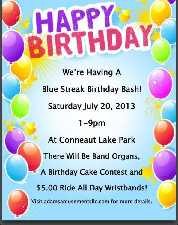 Hey all, in case anyone will be able to attend there will be a event for the Blue Streak's 75th birthday. Come eat cake and ride the Streak! Work is continually being done to the coaster during non operating days and it shows, Its running faster and smoother than I have ever seen. Hope to see everyone there! There will also be some major announcement about a forthcoming improvement to the park that is very hush hush at the moment.