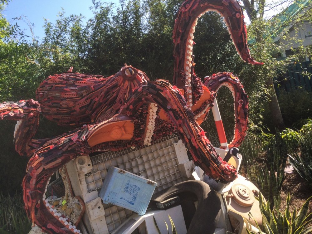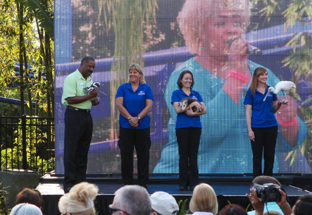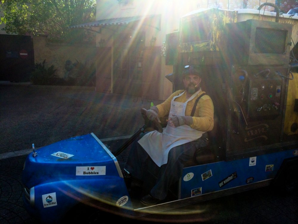 On Friday, March 21, Jacqi and I attended SeaWorld's 50th Anniversary Media Event -which was the kick off for their 18-month "Sea of Surprises" campaign. The campaign is centered around random, unscheduled events throughout the park that will include animal encounters, entertainment experiences and prizes from the "Surprise Squad" - and bubbles, lots and lots of bubbles. To experience elements that are a bit more regularly scheduled, SeaWorld has overhauled the SEA Garden (just outside of the old Hospitality House) - there are additional animal encounters here as well as larger than life sculptures of sea life made entirely of recovered beach trash. SeaWorld promised that there would be many more new surprised to be added as this celebration goes along. The Shamu show will re-open in April and in June, SeaWorld will debut a new nighttime Shamu show "Shamu's Celebration: Light Up the Night". On to the photos... Here is the SeaWorld's 50th logo and icon for the "Sea of Surprises" Media Credential? Check! The main entrance lighthouse now has the new logo. As does the the SkyTower cabin. The media was greeted by Animal Trainers and Entertainment Performers. But watch out for this mime guy. Here was the main stage for the kick off show. Most of the show featured video clips detailing a lot of the good things SeaWorld has done over the years in Animal Research and Rescue. They are responsible for the rescue of over 23,000 animals. These brightly colored people are the "Surprise Squad" - they'll pop up randomly with gifts, reserved show seating, exclusive access to rides and surprises like behind the scenes encounters. So when in the park, you should keep your eye out for these guys. That's Park President, Terry Prather - holding a penguin during the show finale. The new logo is absolutely everywhere... There is a merchandise shop at the front of the park full of 50th logo gear. And there are cool historical photos all around - like this one of the main entrance on opening day in 1973. And this one - the Superhero Water Ski show from the 70s And now on to the random encounters - this guy drives around in his wacky bubble making vehicle. Once he finds a place to park, he creates bubbles of all sizes and encourages guests to help him create even more bubbles. Here's another look at the bubble car. Did we say there were a lot of bubbles? Another random entertainment experience - the "Splash Dance" crew does a high energy, guest participation show that involves a lot of water. Guests are sprayed with sprinklers, garden hoses and even backpack lawn sprayers as the team dances around. Back in the SEA Garden, you will see the beach trash sculptures. Red Trash Octopus. Sadly, there were no trash sharks. (that we're aware of...) SeaWorld will expand their animal encounter back in the SEA Garden area, allowing guest to meets all kinds of animals - like this really cool owl. Work continues on Shamu Stadium. The Shamu show is scheduled to re-open in April. A new nighttime show "Shamu's Celebration: Light Up the Night" will debut in June. -