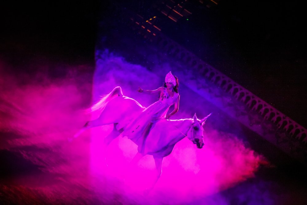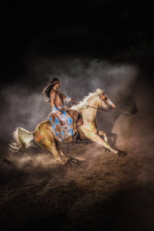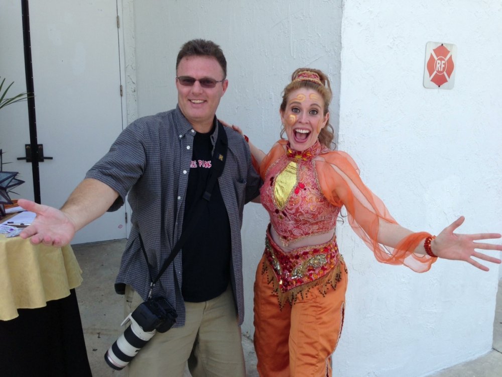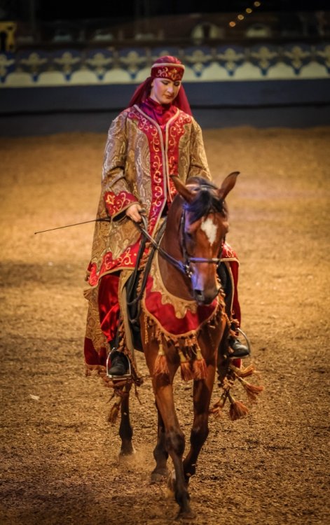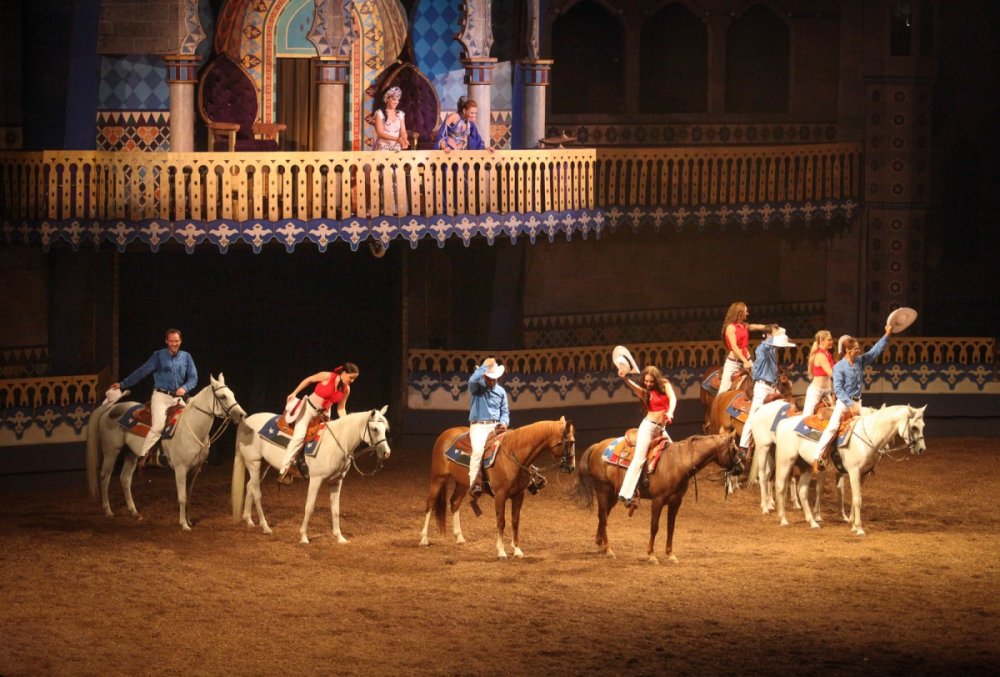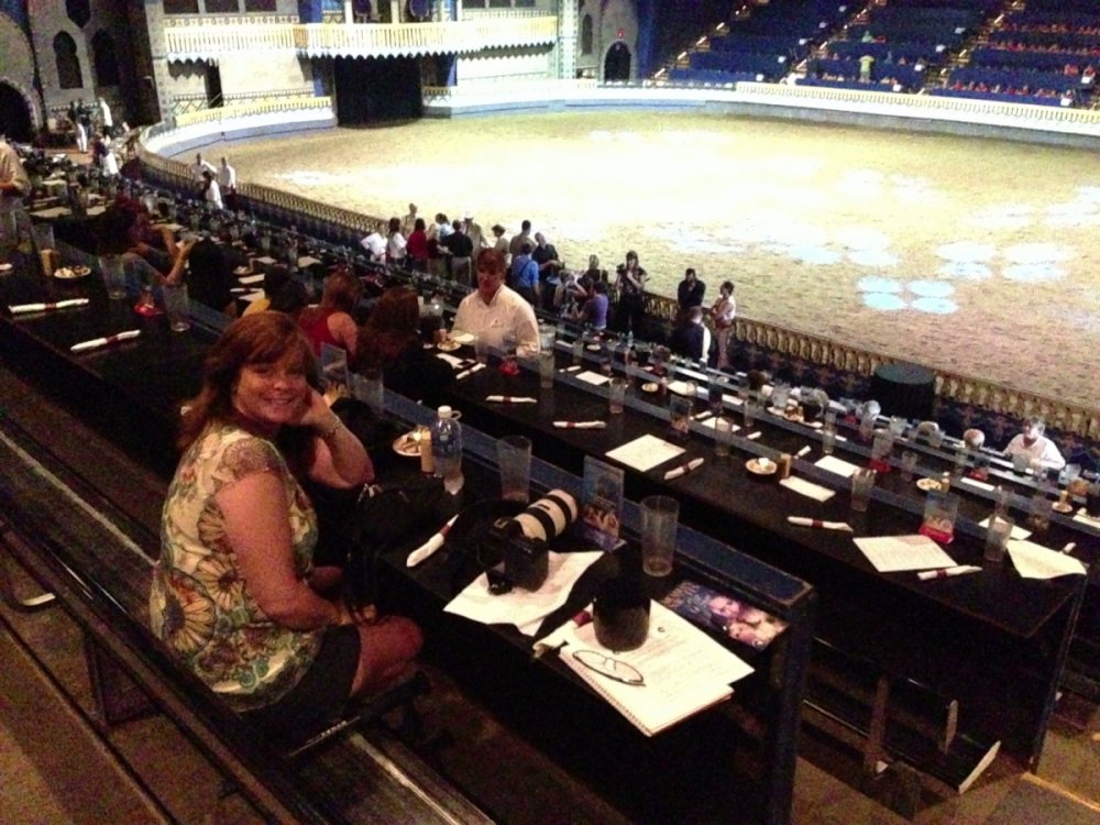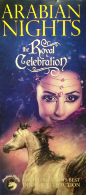 On Tuesday, Aug. 6, Jacqi and I went to the Arabian Nights Dinner Theater to catch the Media Preview of their newest show "The Royal Celebration". Arabian Nights is in Kissimmee, Florida - just minutes from the main Walt Disney World entrance. And to make the event even more special, this year Arabian Nights is celebrating their 25th Anniversary. I've lived in Orlando for over 25 years and I've never seen the show - so I was excited to finally experience it. This is the first new show in 14 years and owner/show writer, Mark Miller describes it as a "greatest hits" of some of their more popular performances wrapped up with a new story. The story involves an Arabian princess who is about to marry the prince of a neighboring kingdom. Their servants (or genies) present them dazzling horse performances as gifts to the soon-to-be wed royals. The horse acts include a Royal Mounted Guard, a Mexican Carnival Celebration, a Unicorn, Wild West Cowboys, Cowgirls and Indians, a Gypsy Circus, a Chariot Race and some silk acrobats - in other words, a little bit of everything. Shows include a full dinner and dessert - and there are a few pricing tiers, some of which include preferred seating and alcohol. It was a fun show and I'm glad I finally got to check it out. Here are some photos... We're in the right place. This is what we're here to see. The Genie Ali greeted everyone as we arrived. Here are our seats and a look at the whole stadium. The performance we attended was an afternoon matinee. Getting ready for the show. Yep, there was a unicorn here. The Gypsy Circus segment had a lot of acrobat elements to it. The performers were very good. And finally, the lone Native American. His segment was very powerful. He was the only one on stage - at times charging across the stadium at full speed.