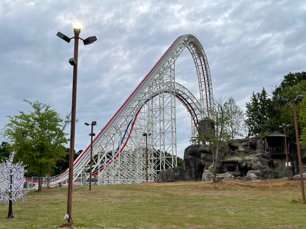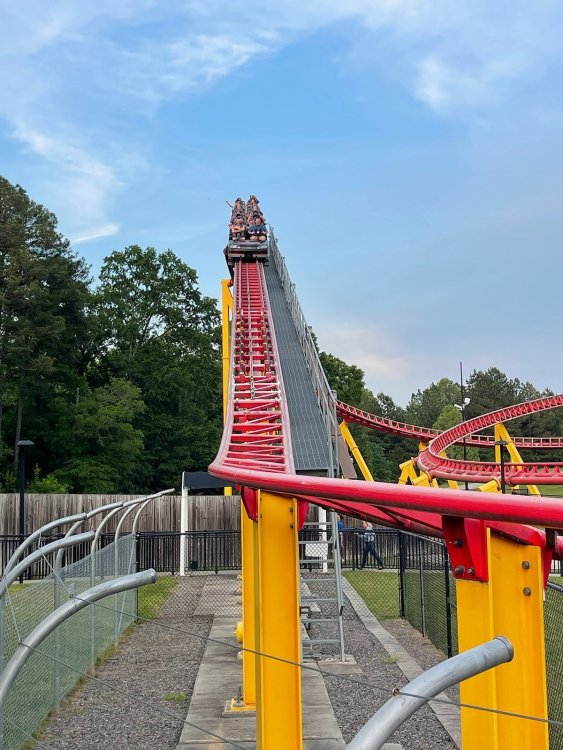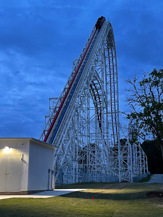 It's been a while since I've posted a review of a coaster or park on here, but I figure I'll give my $0.02 on AF1. We road tripped it from Orlando to Atlanta on Saturday night the 22nd. We got there a little bit later than we wanted to, but still with about 2 hours to go before park closing, around 8PM. When we arrived, we purchased our wrist bands and eagerly headed over to ArieForce One. As it came into view, a train was going up the lift hill...then it stopped. Uh oh. The ride ended up being down for about 40 minutes after that, and from what we heard, it had some difficulty running Saturday. The staff ended up having to take a train off to resolve some kind of block issue, but we got three rides Saturday night, covering the cost of our discounted wristbands. It was moderately busy after AF1 opened, but that was to be expected for a Saturday night. Fast forward to Sunday, we got to the park again around 7PM after spending most of the day at Six Flags over Georgia. The ride experienced no downtime, running one train, and was mostly a walk-on. The staff also allowed re-rides without walking around, which was a nice touch. We got about 10ish rides on Sunday in various rows, including front and back. My review of the ride: I think this is an excellent addition for the park. I'd rank it somewhere in the upper middle of the RMC coasters. Great first drop, the raven truss dive turn was a bit underwhelming but the airtime hill after it was great. The outward banked hill after the zero g stall was great in the front row, a little underwhelming in the back. The double up, followed by single drop is the best part of the ride in the back row. The rolls and quick directional changes are best in front row. I love the ending hills, they provide outstanding airtime in all rows. But I'll echo what others say- those brakes hit HARD. If you're in the back row, brace to be punched in the stomach. For me, the only uncomfortable part of the ride is the extremely quick slow-down. The ride is a good duration and length, the airtime strong and enjoyable. The only RMC coaster I think I've ever felt was "too much" in terms of airtime being painful was some rides I had on Twisted Timbers in the back car on a hot day; moving up to the third-to-last row fixed that. It's so awesome that these intense machines exist and the more parks build them, the better. Our Saturday night view just before the dispatch and breakdown. Our view of the queue shortly after arrival on Sunday night. Sunday night, just as the sun was setting. Night rides on this coaster are awesome. I'm not sure when we'll be back, but hopefully some time soon. Occasionally, we road trip through the mountains to take the scenic route to Pigeon Forge. This would be a great stop to break up the drive. If you're asking yourself "should I get out there and ride this?" the answer is yes.