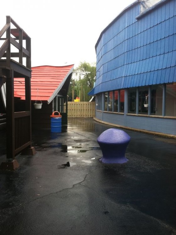 ^ That is correct. Six Flags St. Louis has its drunken barrels ride left rotting right in the middle of the park, across from the mine ride. Speaking of which the building next to River King Mine rides station is the old station and storage house for the dueling half of the ride. The current River King Mine Ride storage track area also has clearly had the building that was attached to it removed. I have no idea when this happend but it is evident by the wooden posts surrounding the transfer track. Six Flags Great America has also re-used Deja Vu's old entrance sign as Buccaneer Battles sign.