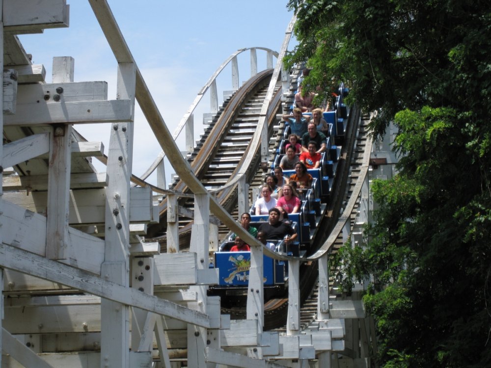 I can see how on a busy day 1 train operation would be a problem; the staff was just doing "okay" with dispatches. Overall, I still think it's decently fun except for the exit of the corkscrew---major head bang-age.