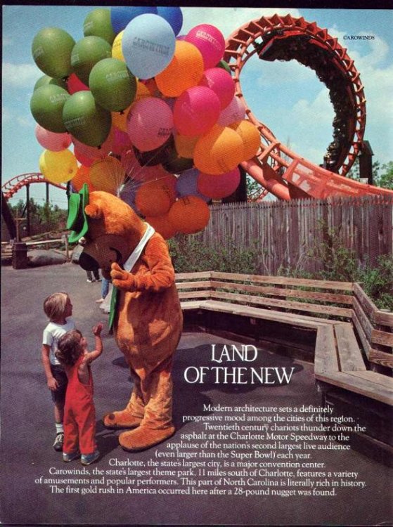 Since everyone is feeling so retro these days, I thought I'd pull out some old pics I posted several years ago for the newer folks to enjoy. I'll start with my home park Carowinds. Carowinds and I literally grew up together. I was 1 when Carowinds debuted, as you'll soon see. Hope you enjoy these, and you TPR dbase guys are welcome to use any of the shots as well. We'll start with the ship that the Borg sunk! Good memories of this ride, and how it looked at the front of the park. Here is my brother with the original carousel at the park, a double decker! Check out the fro! My dad and brother are riding the then Powder Keg Flume. A big red B&M is sitting here today. Oh wait, I need to be more specific, a big red, hyper, B&M is sitting here today. Proof positive I was at the park opening year. That's me in the stroller. Retro Goldrusher. You can see the cable car cables in this one. Outer Hanks was one of the stations. I still can't seem to place where this ride was in the park. The park actually used to have two car rides, and now has zero. Scrambler, before it lost its original name and colors. Ditto for Scream Weaver. Used to be Meteorite and located where the Yo Yo is now I think. My brother with Michael Jackson's train! Ah! Honestly though I'm not sure if this is the one Michael bought, but he did purchase one of the two trains that ran at the park. Woodstock Express, 2 names ago and several coats of paint too. I believe it was still the "Eastern Airlines Skytower" then. I miss this ride. White Lightning was located not too far from our current shuttle coaster, Carolina Cobra. Creepy. Kooky. Mom with bro and I. I think this was over in Pirate Island, which is now the water park and the Carolina Cobra area. Speedway. The other car ride. Located where Vortex is now I believe. Not sure if this was in the now Nick, er, Planet Snoopy theater or not. So much has changed in this area over the years. Don't know if this was in Indian Thicket or what section of the park. And finally an old ad I found with the original Carolina Cyclone colors. Red! What a concept! I better not show this to Cedar Fair. Also notice the old Carowinds logo on the balloons. This was the end of the park before Wayne invaded. -