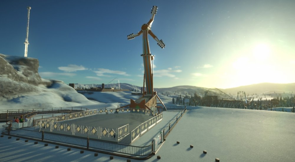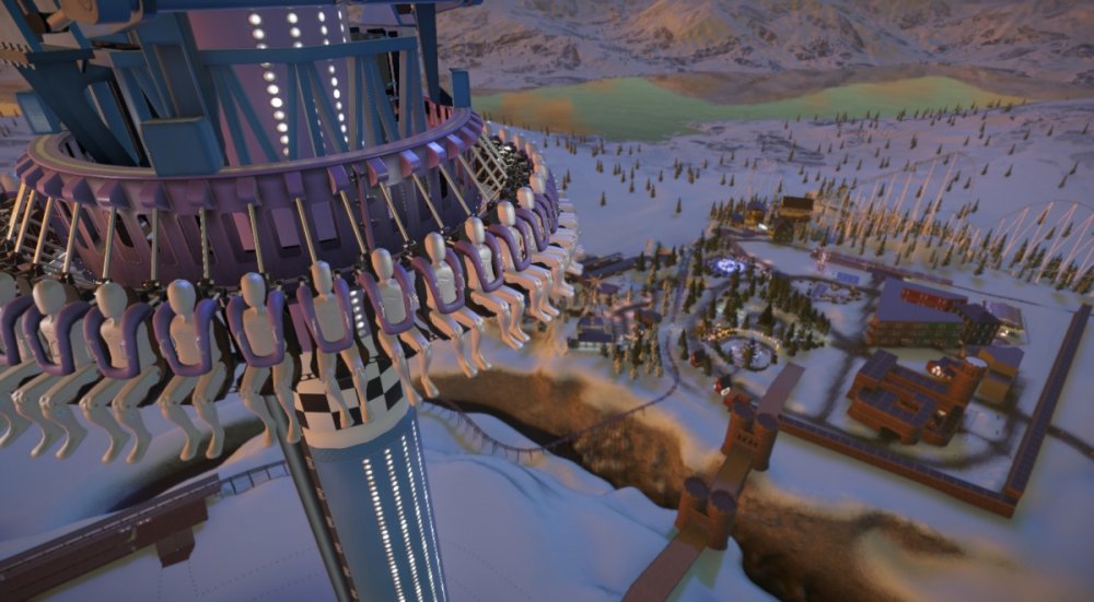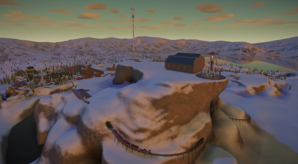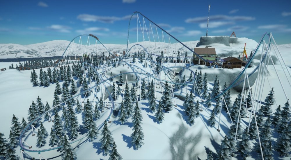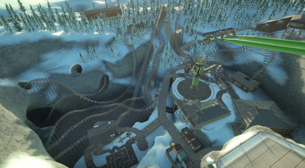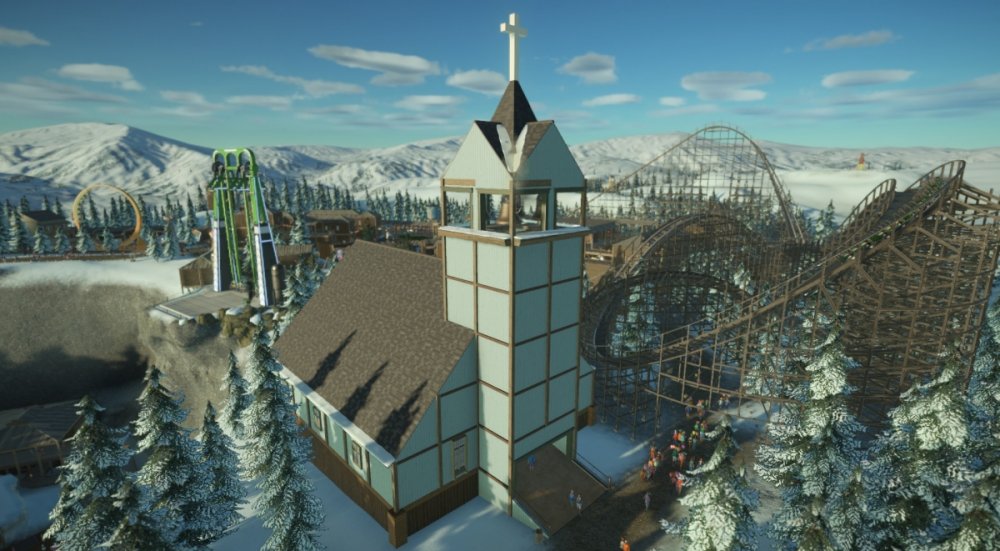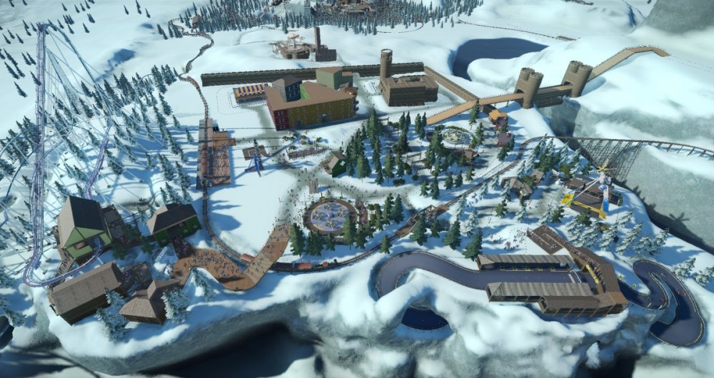 My interest in playing Planet Coaster has gone up and down a lot, and I have been veeerrrryyyyy slowly chipping away at this park. Little details here, big changes there, and at some point totally forgot to give updates to this park... which has now received quite the expansion since the last update here. I will attempt to shine light on what I can without getting too abundant on photos. 6 lands: (counterclockwise from bottom-right) Welcoming Center, Slums, Mining Pit, Gated City, Castle, and Farmlands. Slums/mining: The slums had received a bit more detailing after the majority of the layout was already setup. I'm comfortable enough to say that the slums is complete, but could definitely benefit from some more tiny details being thrown in. Knock knock? Get the door, it's religion. The mining pit also received some love. It still needs buildings to be built and more scenery thrown about, but the layout of the area and the attractions are all pretty set in stone. I'm not a fan of large, sprawling coasters, but this area asked for one considering it's the most dangerous of all the lands. The Forge, and Iron Fury roller coaster in the background. Iron Fury diving into its tunnel. Gated City: This area took a lot of thought on how I wanted it to look, but I think I can still get it to be consistent enough with the other lands. I'm aiming for a city/downtown-ish feel with a small park, carnival, and historic building mixed in. This area is still under heavy editing, so things will likely get changed and replaced at some point in the future, though. Gated City recent overview. WIP though, things are gonna be changed around pretty heavily. Snowflake flipping from the back corner. Yeti roller coaster. Castle: It wouldn't be Castle Tundra without a castle, right? That aspect is still in the works, but I slowly jump into this area to plant things and see how it fits into its own land and how it interacts with other lands. I'll come back to it eventually, likely once I get Gated City a lot more fleshed out. Gotta get sidewalk going up the slope to the top, and get base design of teh castle, courtyard, miscellaneous buildings, etc. Bare interior for now, but there's sidewalk in it and guests will be able to walk around inside. Realistically, that drop tower would never run. Too cold and too windy up there. Farmlands: The very last land I'll start building up are the rural farmlands that will grow crops for the surrounding lands. Easy walk to and from the welcoming center for guests. Windmill will receive a barn for its queue scenery, and a farmhouse will be close to it as well for eatery. I'm hoping to leave some space for the new game update that will allow tables to eat at as well so I can have patio spaces. Miscellaneous fun facts: -There was 7471 guests in the park when I shot my most recent screengrabs. -Tundra Express railway stretches 3572m long and currently runs 10 trains (probably only needs 8, but I'm experimenting for now). Each train runs 4 cars and holds 96 people. -