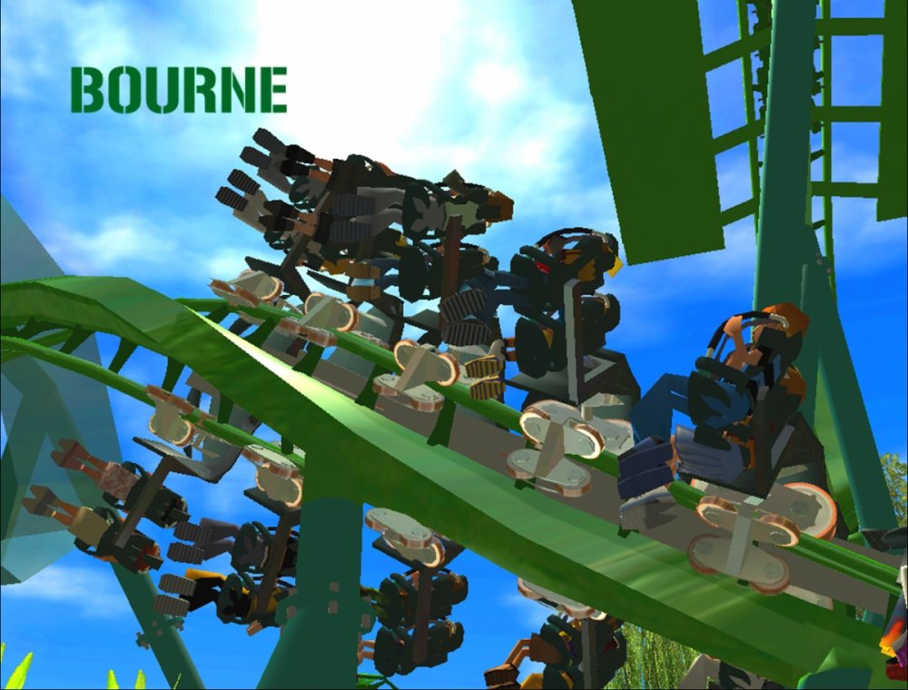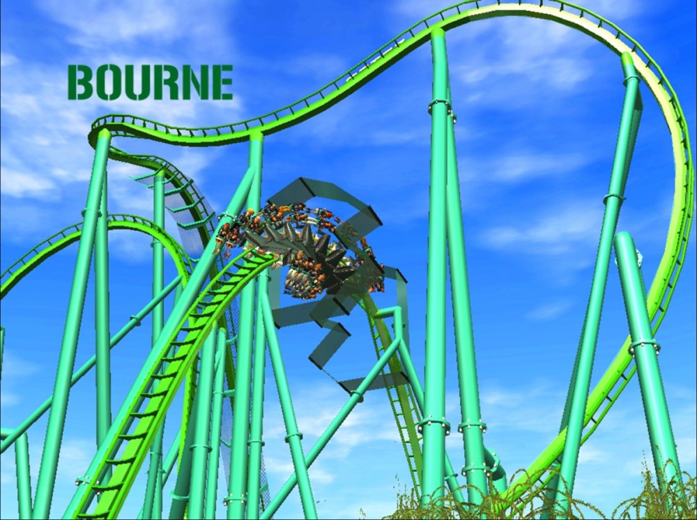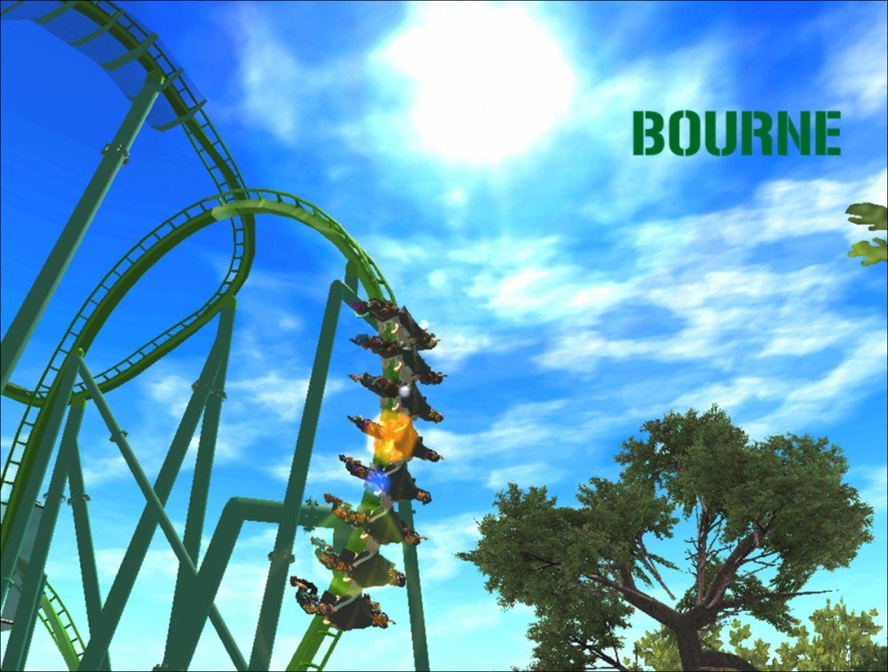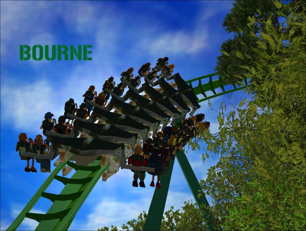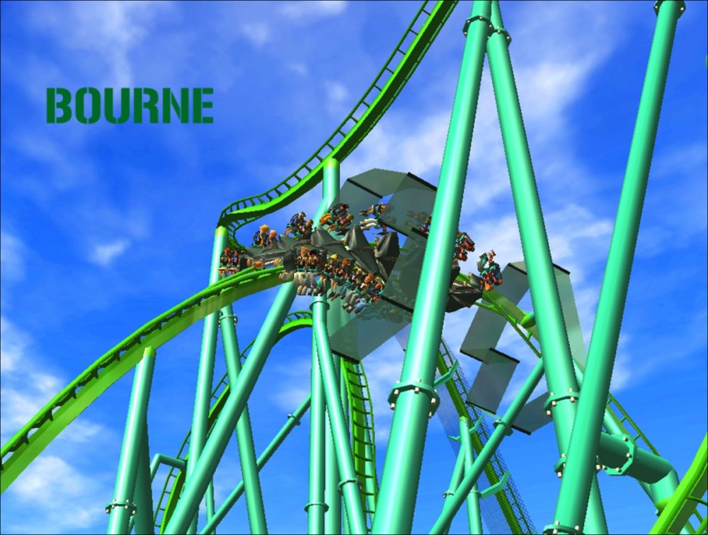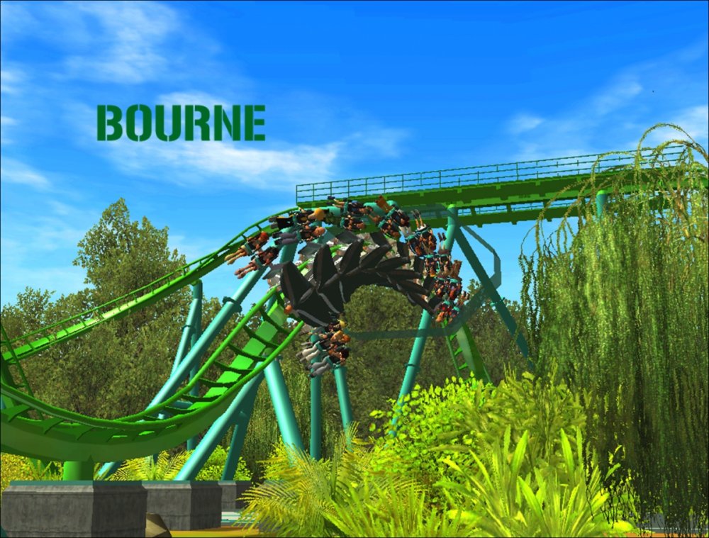 Bourne Break the Boundary Within life, there are limitations in almost everything we do. There are a set number of gallons of gas you can put into your car, a limited number of items you can have to go through the express line at a grocery store, and even a maximum on how long your body can go without food or water. But have you ever thought about a place where boundaries and limitations don't exist? Meet Bourne An inventive and experimental B&M Wing Coaster that breaks the boundaries of what modern roller coasters are accepted to be. Bourne, an archaic term meaning a boundary, limit, destination, or goal, was designed to show how limitations within our world affect our everyday lives. But, there is a place where these boundaries and obstacles can be overcome; a place where endless opportunity and inventiveness is available. That is the environment in which Bourne resides. Featuring the world's first inverted Pretzel Loop, a vertical drop, a Flying Snake Dive, keyhole elements, and another world's first, an inverted corkscrew, Bourne takes realistic roller coaster layouts and breaks the boundary that was once accepted. Fly through multiple head and foot choppers, soar through keyholes, and kick the glass boundaries that occur throughout the whole experience of Bourne to become a part of the ideal environment. When initially designed, Bourne seemed almost too futuristic, too intense, too outgoing, too extreme, and too exciting. Yet when faced with the future that griffonj2022 has in front of him, this is the long-awaited "key" that unlocks the doors to PHASE III, a new project from griffonj coming JUNE 21, 2013. Bourne also completes the DNA Phase, a year-long set of attractions that delved into the DNA of griffonj and produced nine designs over the course of July 2012 to June 2013. Bourne offers the closing of one book and the opening of another, a transitional design that breaks the boundaries of what is acceptable in the RCT3 realm. So there's only one question remaining: Are you willing to Break the Boundary? -