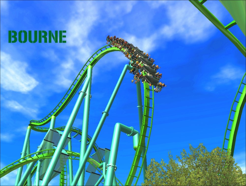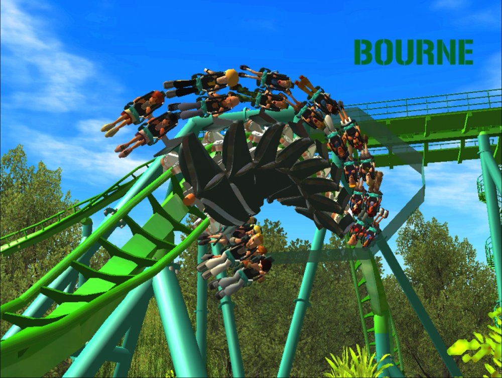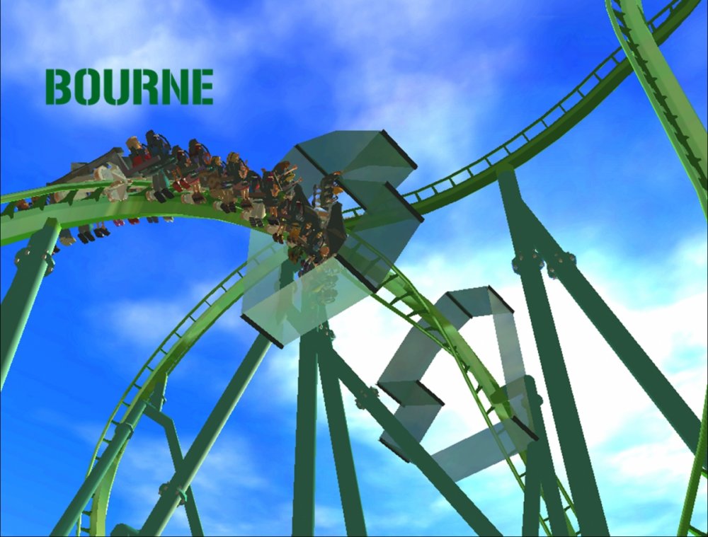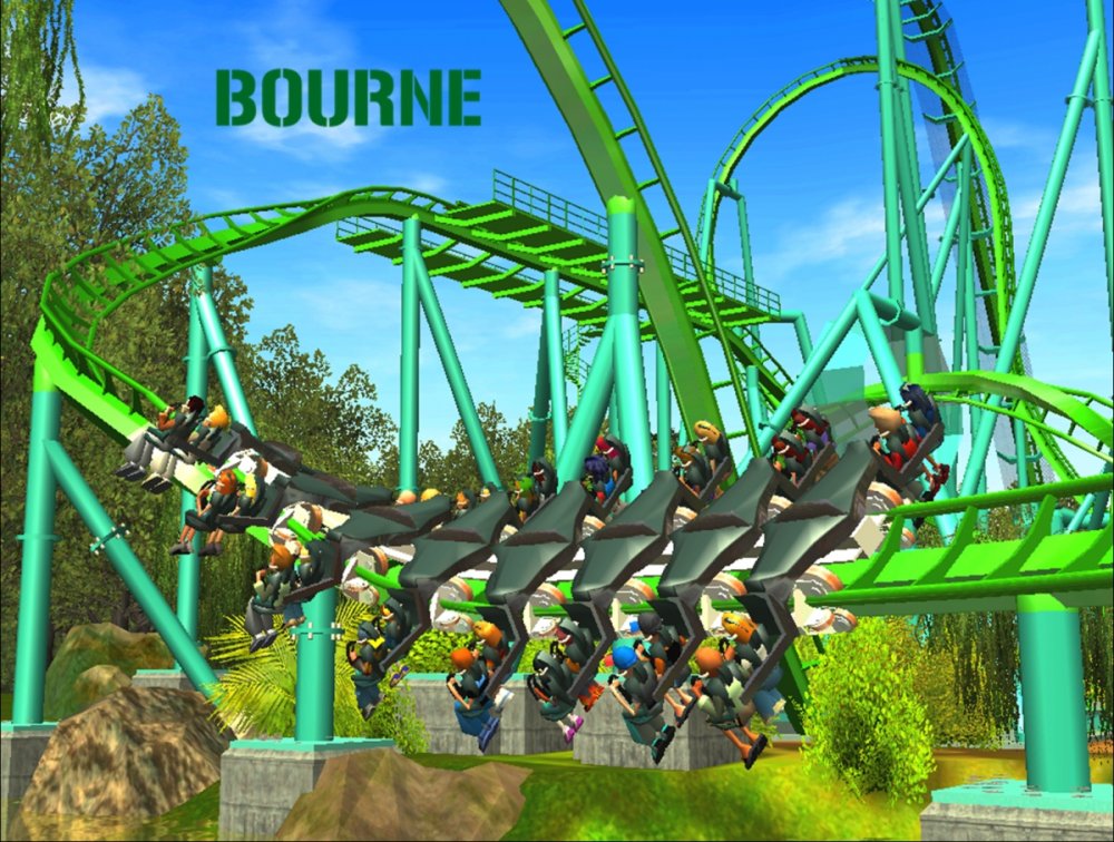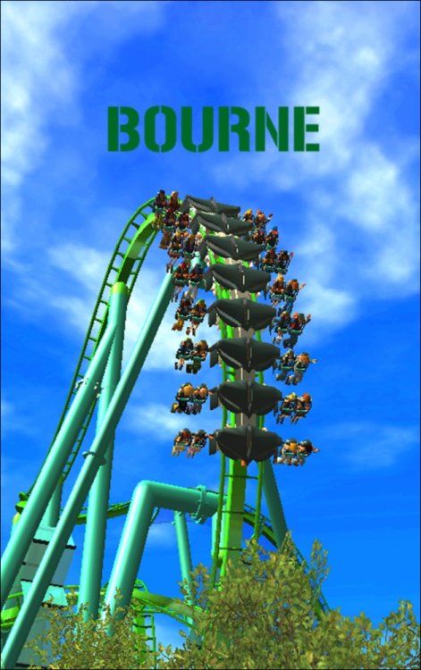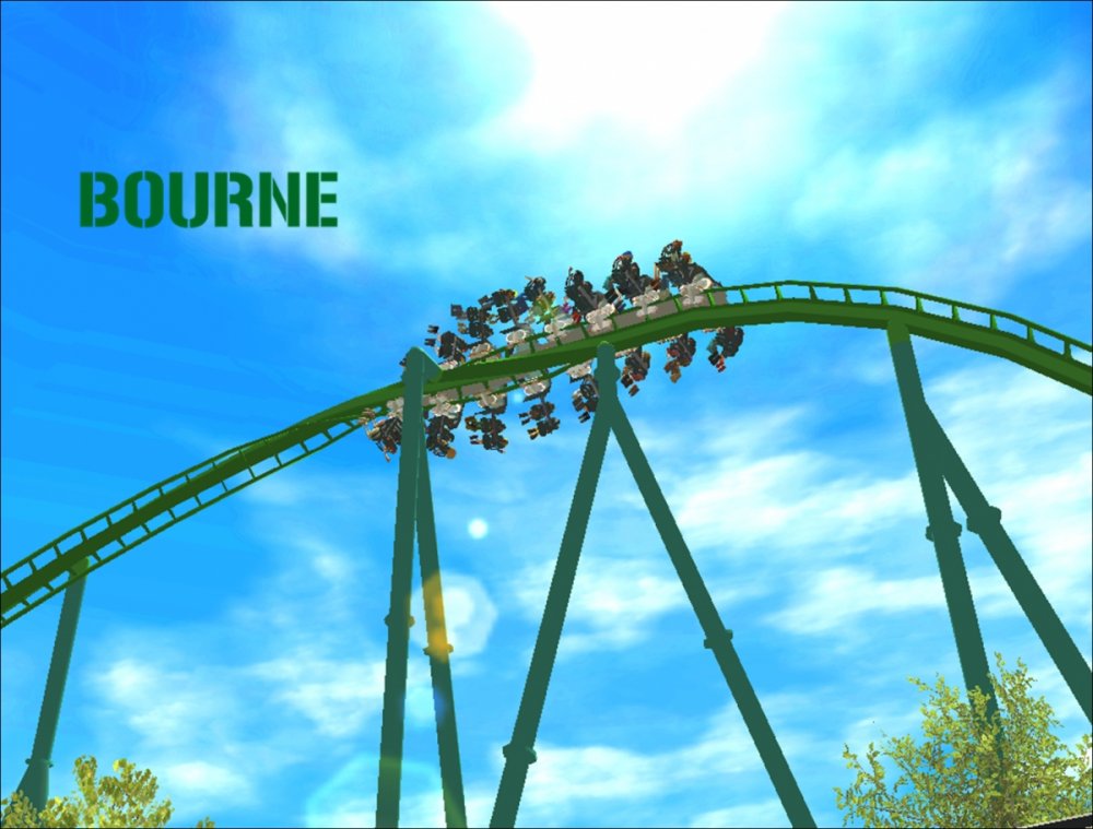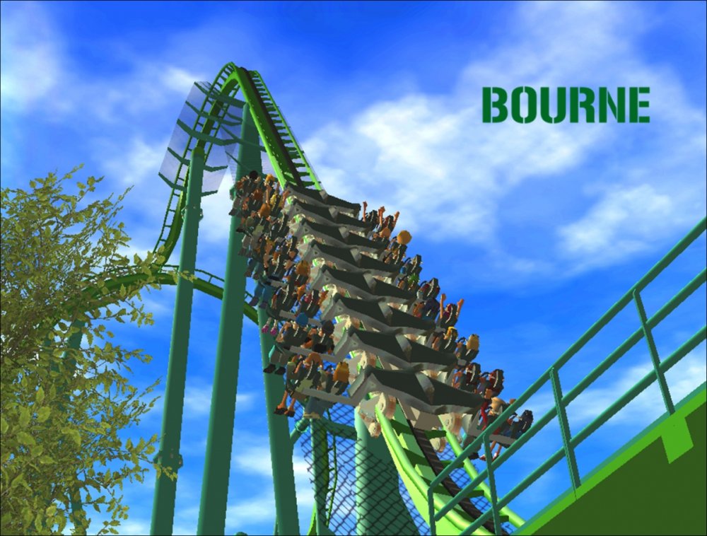 Bourne Break the Boundary Within life, there are limitations in almost everything we do. There are a set number of gallons of gas you can put into your car, a limited number of items you can have to go through the express line at a grocery store, and even a maximum on how long your body can go without food or water. But have you ever thought about a place where boundaries and limitations don't exist? Meet Bourne An inventive and experimental B&M Wing Coaster that breaks the boundaries of what modern roller coasters are accepted to be. Bourne, an archaic term meaning a boundary, limit, destination, or goal, was designed to show how limitations within our world affect our everyday lives. But, there is a place where these boundaries and obstacles can be overcome; a place where endless opportunity and inventiveness is available. That is the environment in which Bourne resides. Featuring the world's first inverted Pretzel Loop, a vertical drop, a Flying Snake Dive, keyhole elements, and another world's first, an inverted corkscrew, Bourne takes realistic roller coaster layouts and breaks the boundary that was once accepted. Fly through multiple head and foot choppers, soar through keyholes, and kick the glass boundaries that occur throughout the whole experience of Bourne to become a part of the ideal environment. When initially designed, Bourne seemed almost too futuristic, too intense, too outgoing, too extreme, and too exciting. Yet when faced with the future that griffonj2022 has in front of him, this is the long-awaited "key" that unlocks the doors to PHASE III, a new project from griffonj coming JUNE 21, 2013. Bourne also completes the DNA Phase, a year-long set of attractions that delved into the DNA of griffonj and produced nine designs over the course of July 2012 to June 2013. Bourne offers the closing of one book and the opening of another, a transitional design that breaks the boundaries of what is acceptable in the RCT3 realm. So there's only one question remaining: Are you willing to Break the Boundary? -