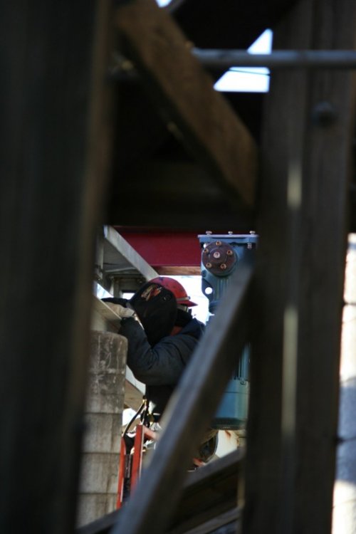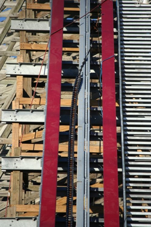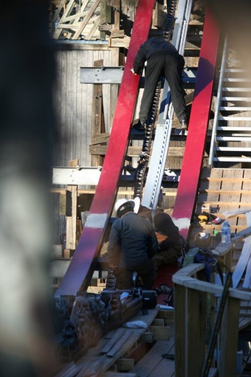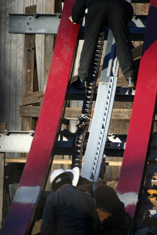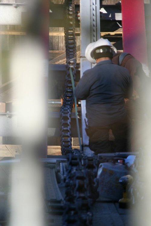 Figured I'd throw in what I got today, the chain gang was still out at 4pm, they all packed it up and left around 5:15. Interesting to watch how they do it, I figured they just mount a winch at the top of the hill and start pulling, but as I saw, it's much more complex... station shot, they had the lights on in the station, and a chair in place for the supervisor. and several shots of the chain install waiting for me ok ok, and all of you too!! there was a lot of welding going on on the transfer track. Looked like they were installing the drive motors you have to look hard, but they are there and for some classic ride shots to end the day. sorry Texas, in Oklahoma we point longhorns down